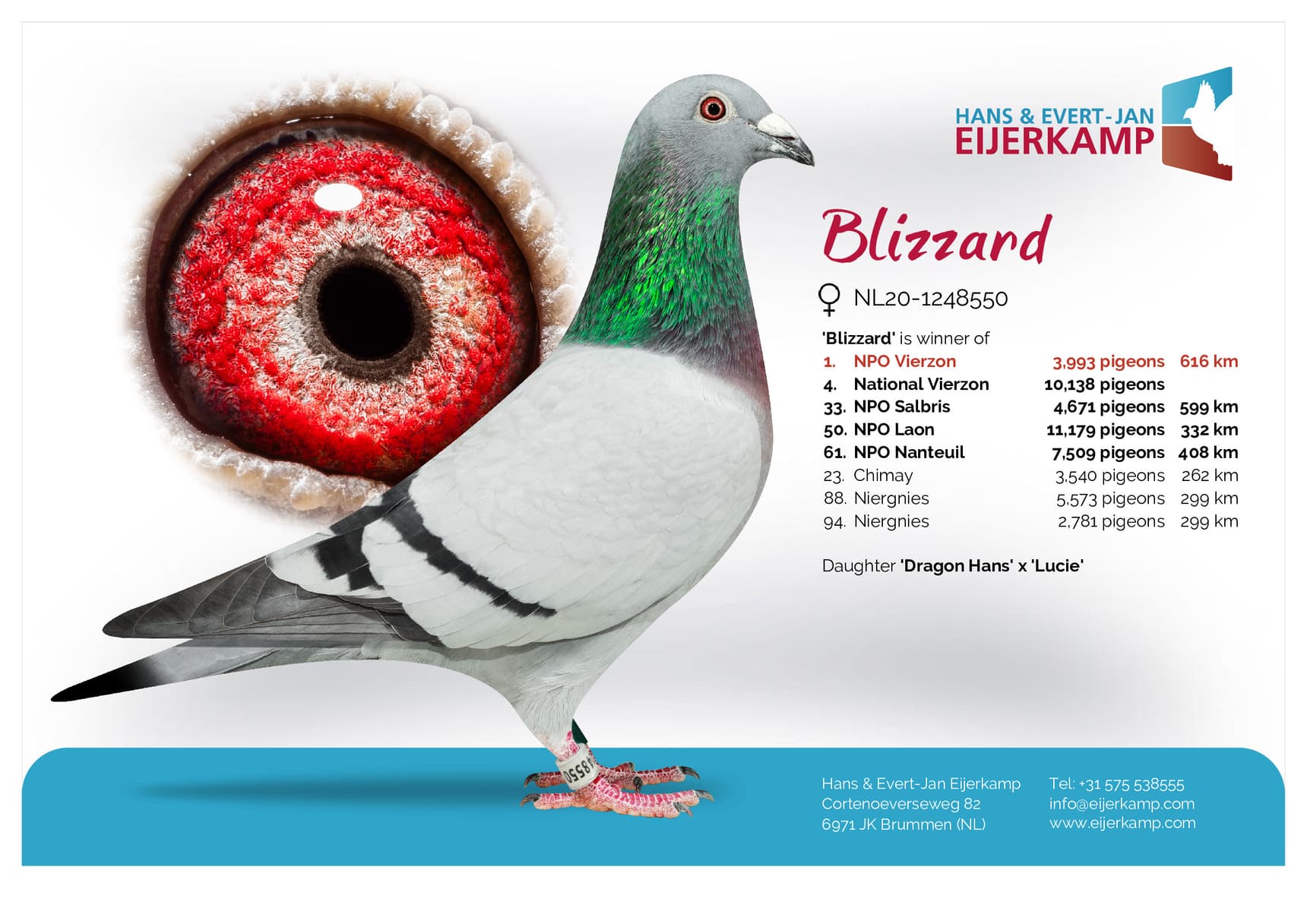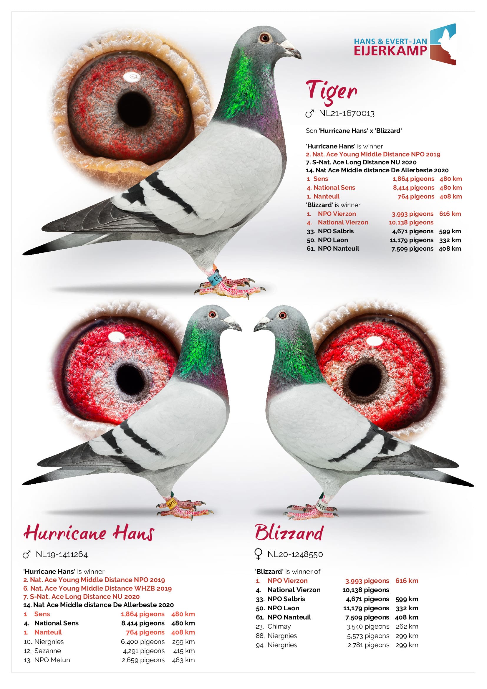 Direct son “Olympic Hans” (Olympiad bird Allround Brussels ’17 – 3rd Nat. ace Fond WHZB) x “Indy” (3rd Nat. ace allround hens WHZB ’15)