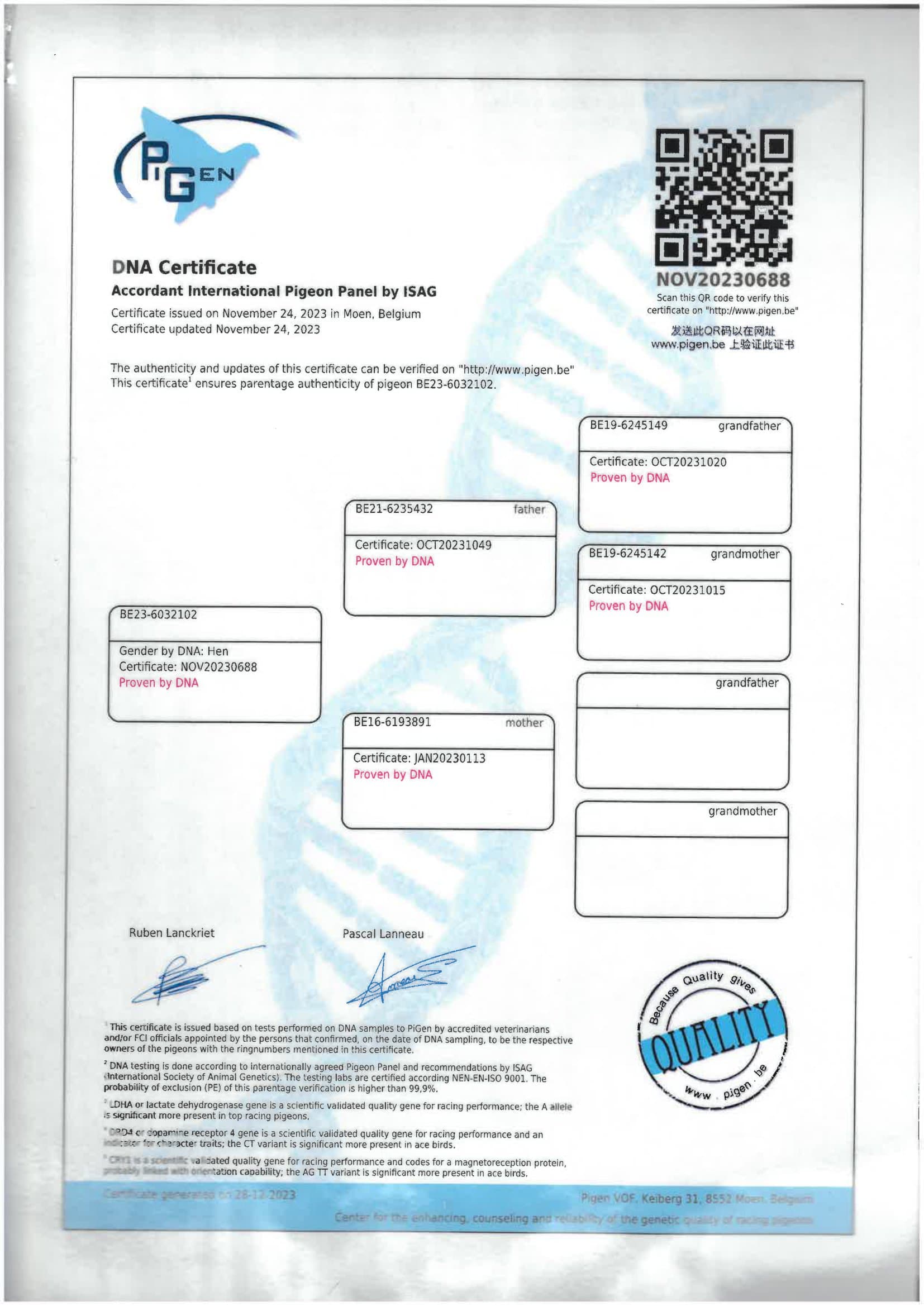 The famous breeding lines of “Tom”, “Barbara” and “Laura” crossed with the “Neptunus” breeding line of Gaby Vandenabeele