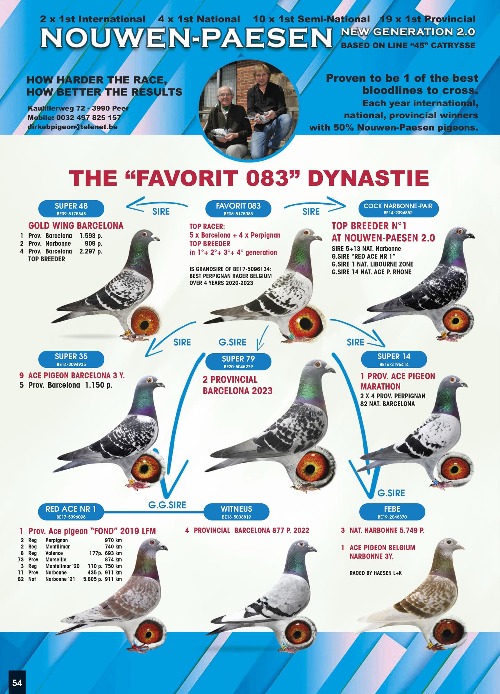 Direct son “Favorit 083” (3rd Primus Interpares Brugse Barcelona Club – 2nd Prov. ace KBDB – 99th and 119th Nat. Barcelona winner)