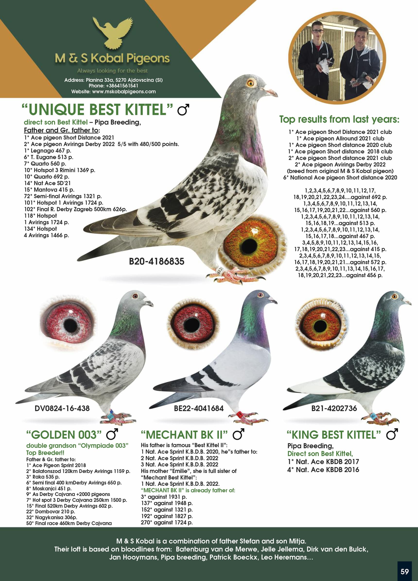Direct daughter “Beauty Kittel” (son out world-famous “Kittel” – Dirk Van den Bulck) x “Best Kittel Queen” (half-sister to several top winning birds – granddaughter “Best Kittel” and Olympiad bird “Olympic Jules”)