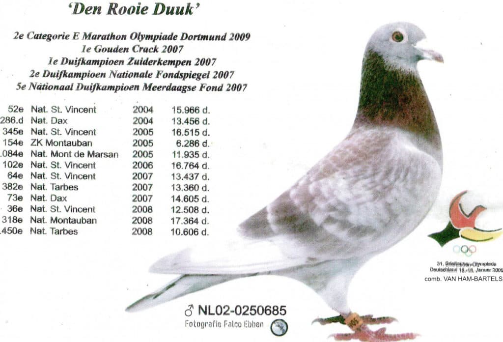 Den Rooie Duuk was just like his grandson Red Bullens a phenomenal racer on the marathon! Also he grew into an absolute legendary breeder in the pigeon sport.