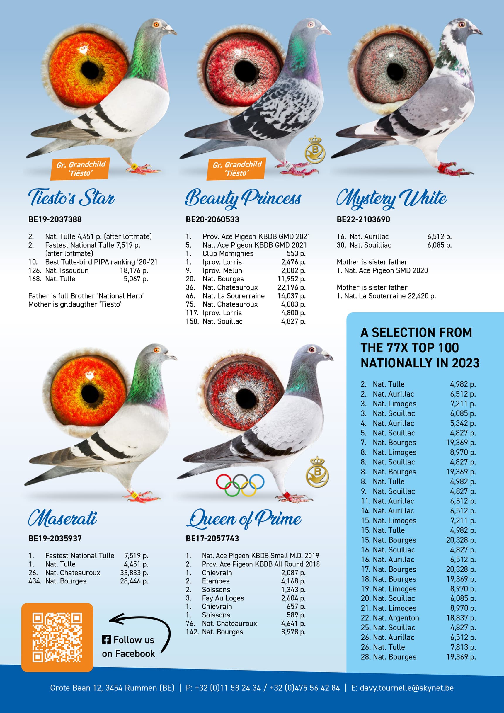 The first auction of superstar Davy Tournelle from Rummen is currently starting. Yesterday he received a nice reference from the Far East. An inbred product of “Tiesto Fantasy” BE 11-2077362 (Son of stock father Tiesto) and stock father Tiësto is currently the 1st ace pigeon over 3 races of more than 500km in the Xi'an Glory Pigeon Club China.