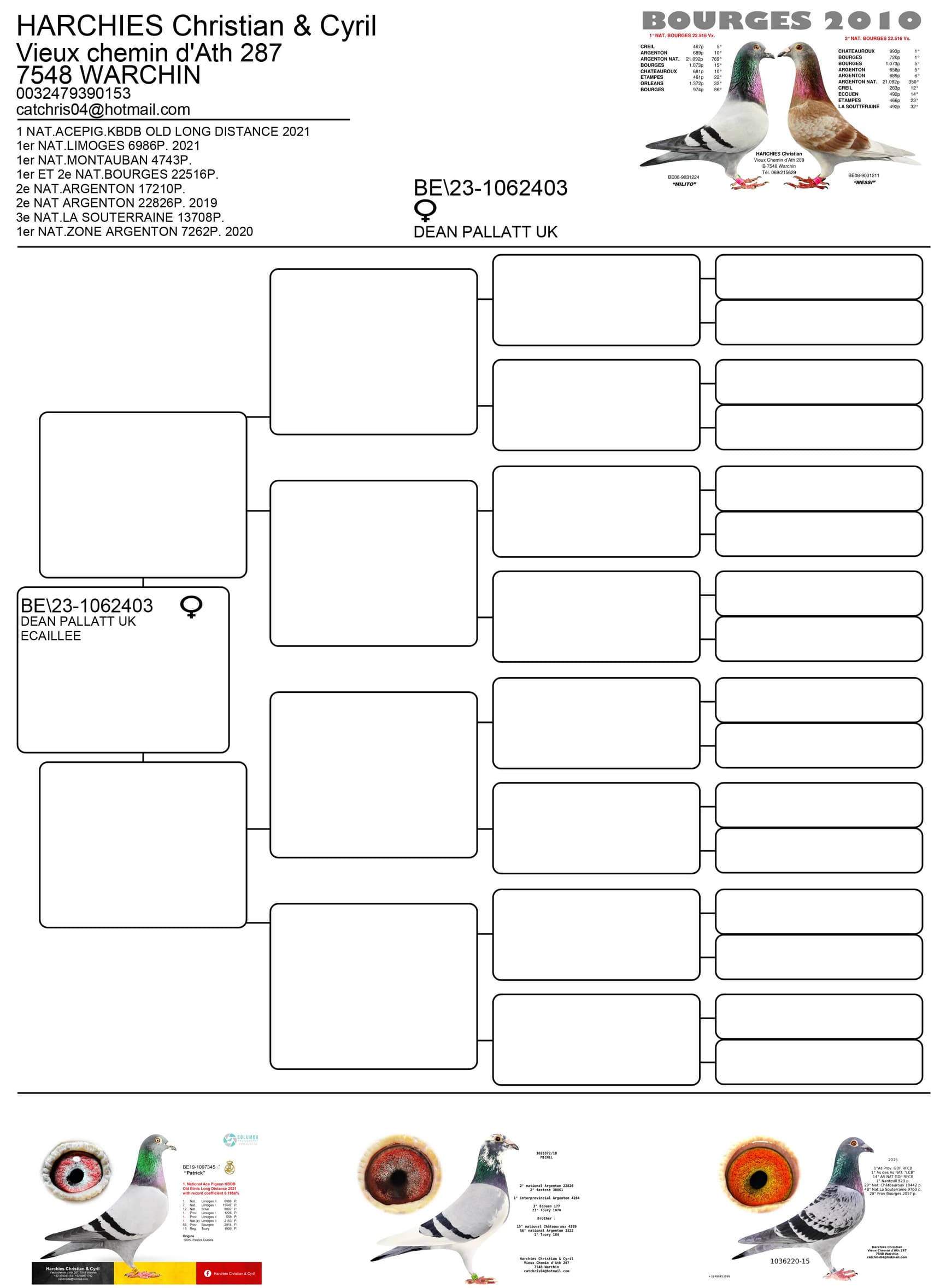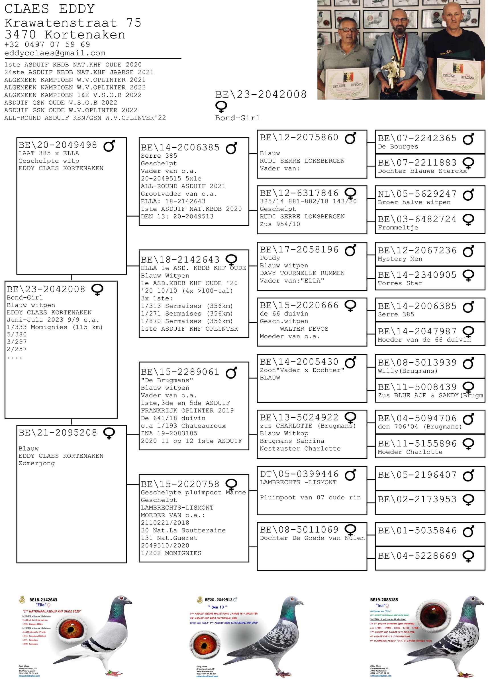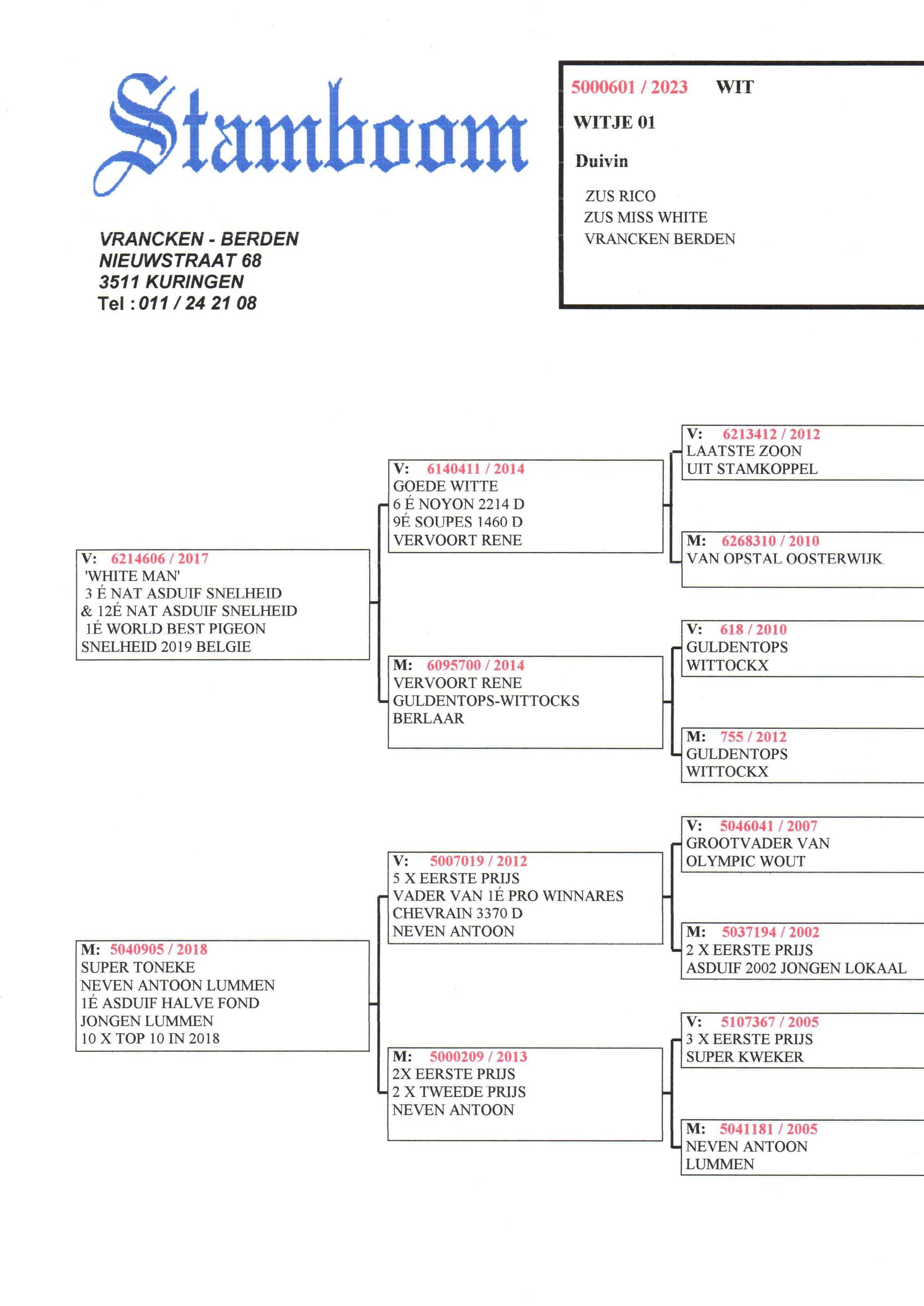 This top hen is a full sister of "Olympic Rico" and "Miss White" 1st and 4th National Ace Pigeon sprint youngsters KBDB and comes out the super couple "White Man" x "Toneke". She also won 6 Chimay 2,697p – 12 Laon 1,650p – 26 Mettet 3,010p - 31 Mettet 2,337p