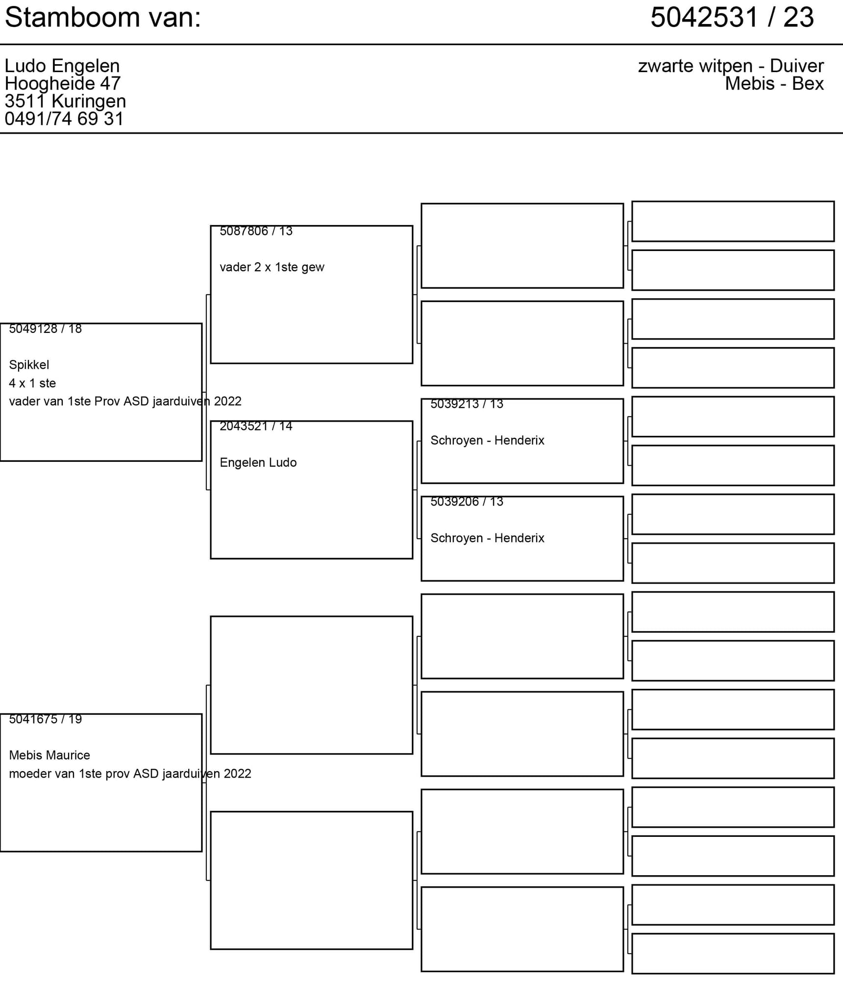 This cock is a direct pigeon from Mebis - Bex, his father "Spikkel" won 4 x 1st. He is a full brother of 1st Prov Ace Pigeon sprint yearlings KBDB 2022.