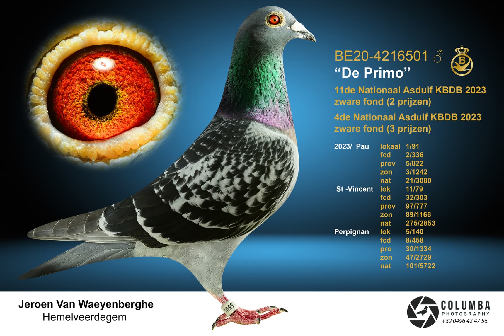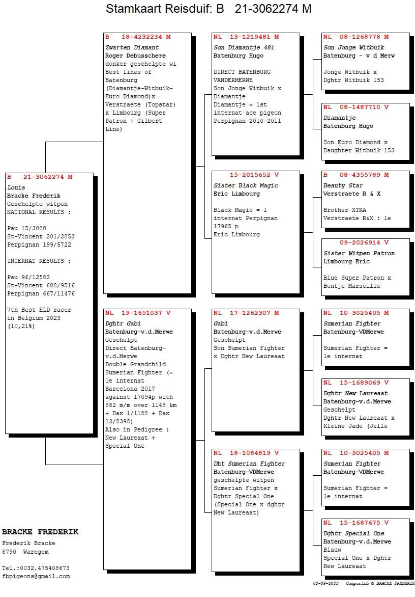 This top pigeon “Louis” was the 7th best pigeon in Belgium over 3 extreme long distance races nationally this season and finished here with silver. His father is “234/18” Zwarten Diamant from Roger Debusschere and is Batenburg – Van de Merwe x “Zus Black Magic” from Erik Limbourg. The mother is “NL 037/19” Inbred Sumerian Fighter 1 Int.Nat Barcelona 2017 Batenburg – Van de Merwe