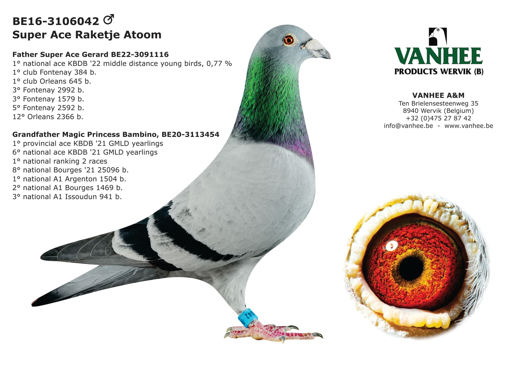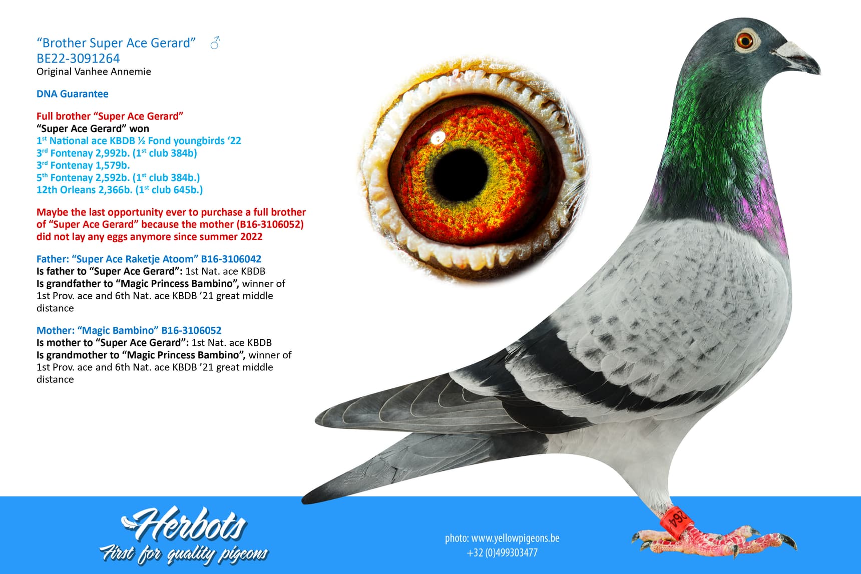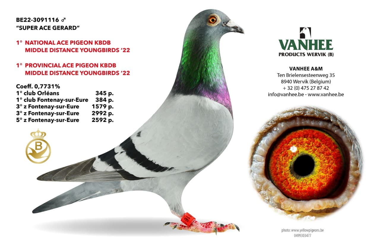 "Super Ace Gerard" was born from "Super Ace Raketje Atoom" (B16-3106042) x "Magic Bambino" (B16-3106052). This pair are also the grandparents of "Magic Princess Bambino", winner of 1st Prov. ace pigeon and 6th Nat. ace pigeon KBDB '21 great middle distance.