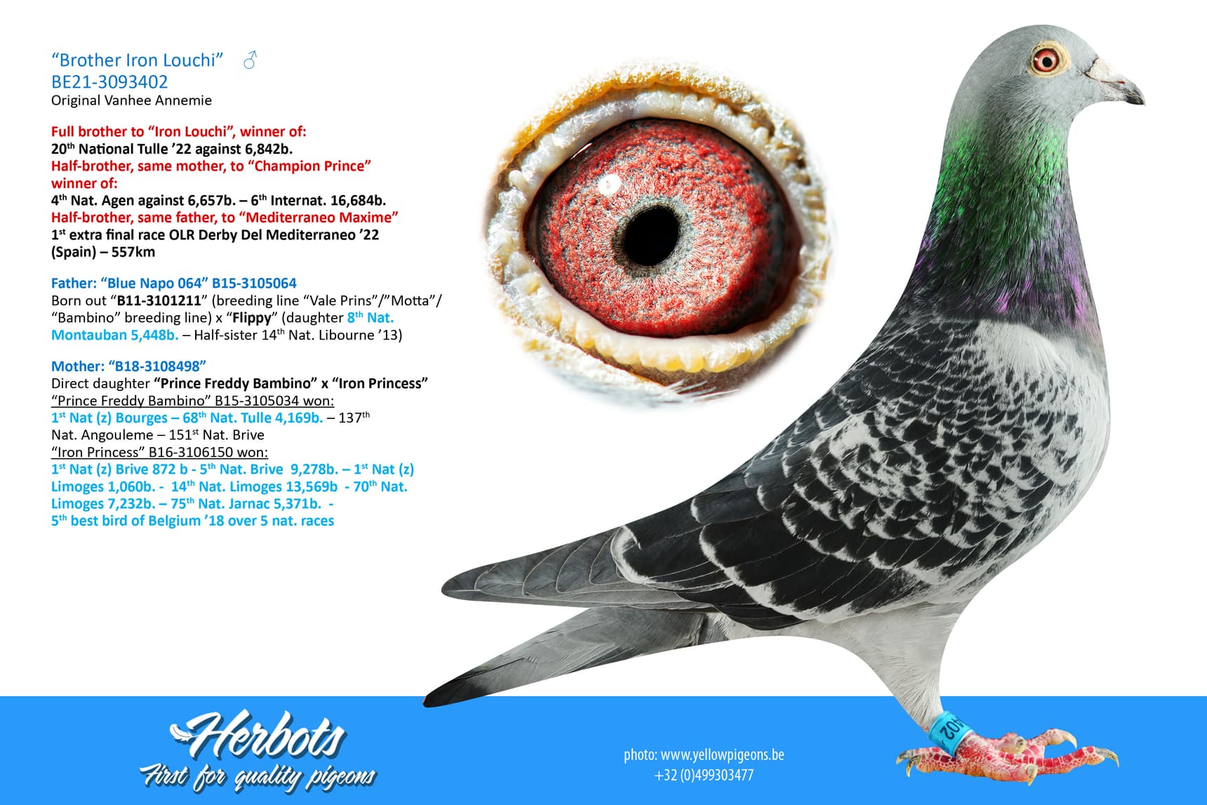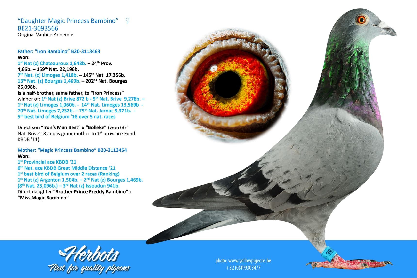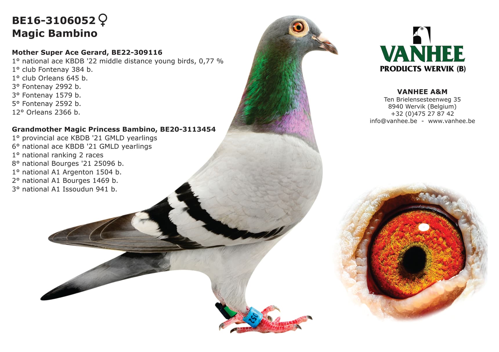 "Super Ace Gerard" was born from "Super Ace Raketje Atoom" (B16-3106042) x "Magic Bambino" (B16-3106052). This pair are also the grandparents of "Magic Princess Bambino", winner of 1st Prov. ace pigeon and 6th Nat. ace pigeon KBDB '21 great middle distance.