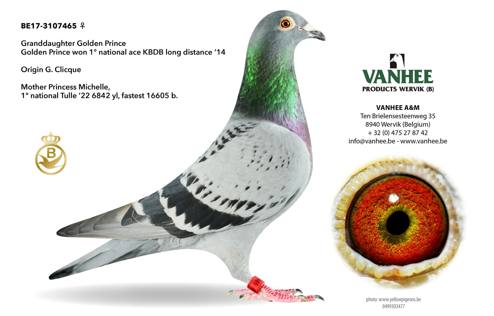 annemie vanhee (wervik) 1st national ace kbdb ½ fond young birds - 1st national tulle '22 - fastest 16,605b.