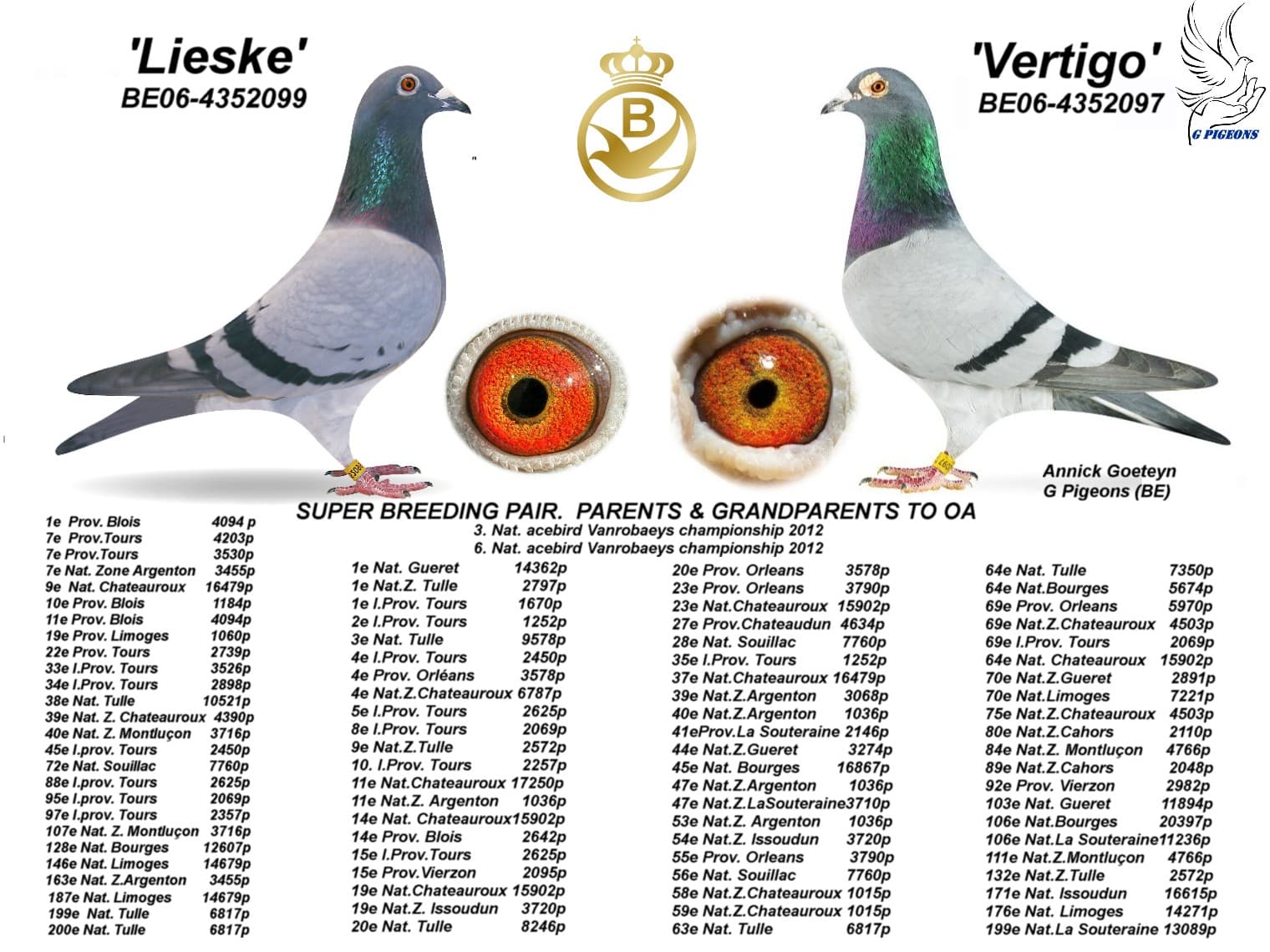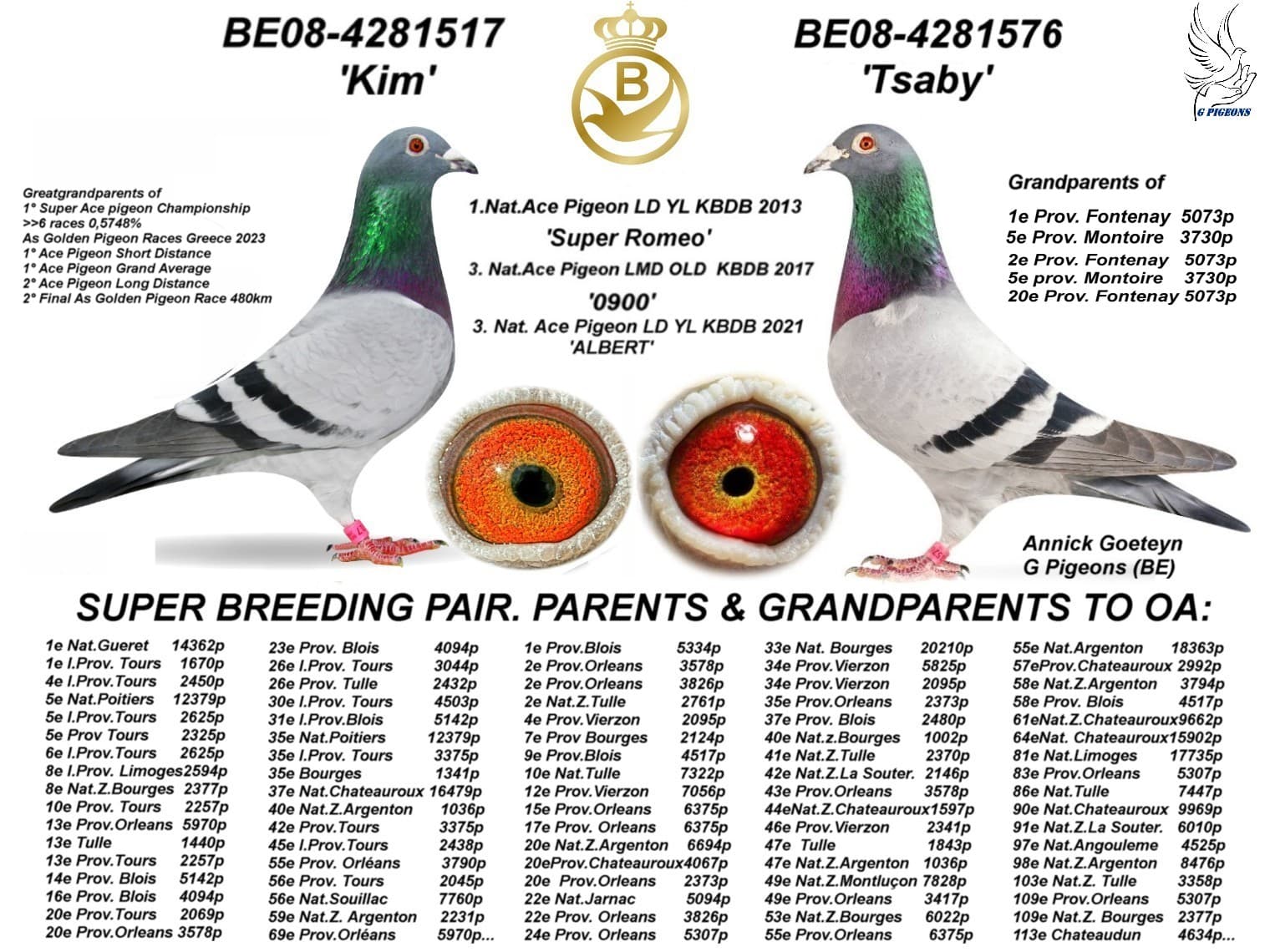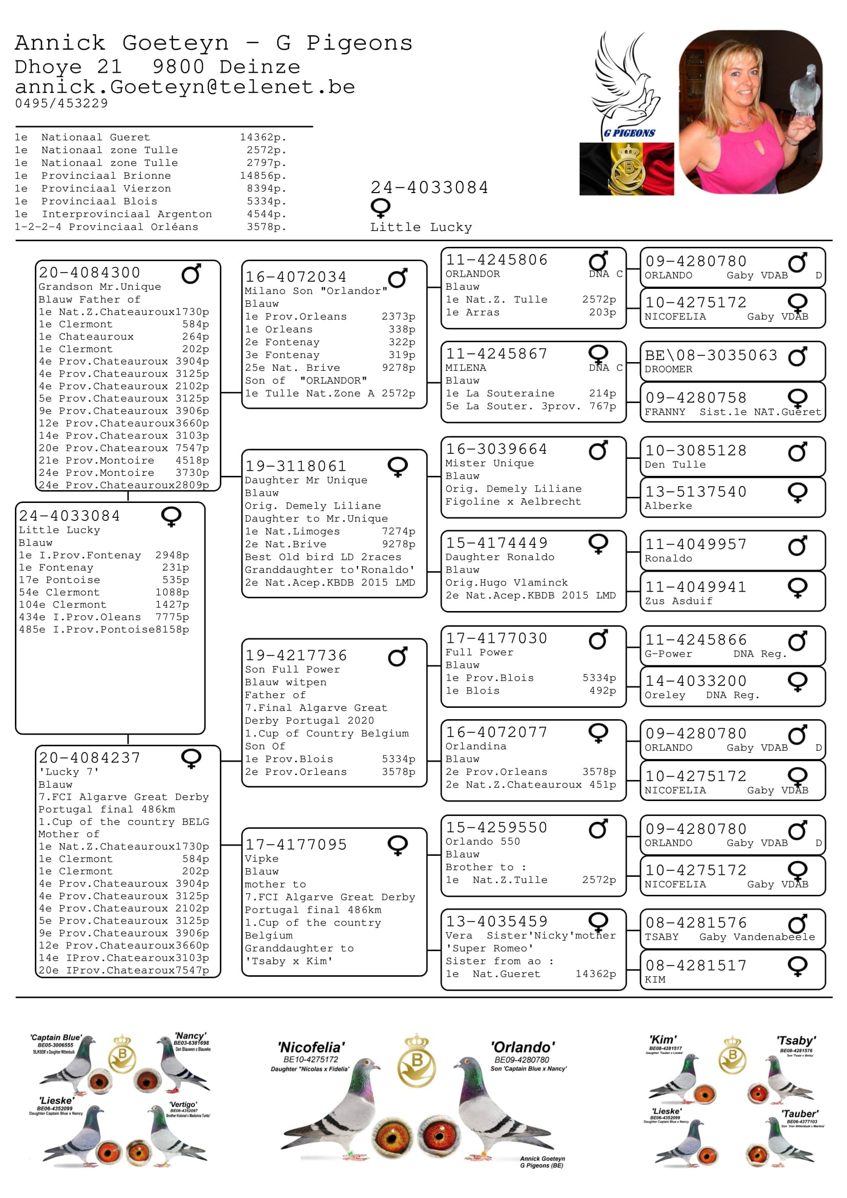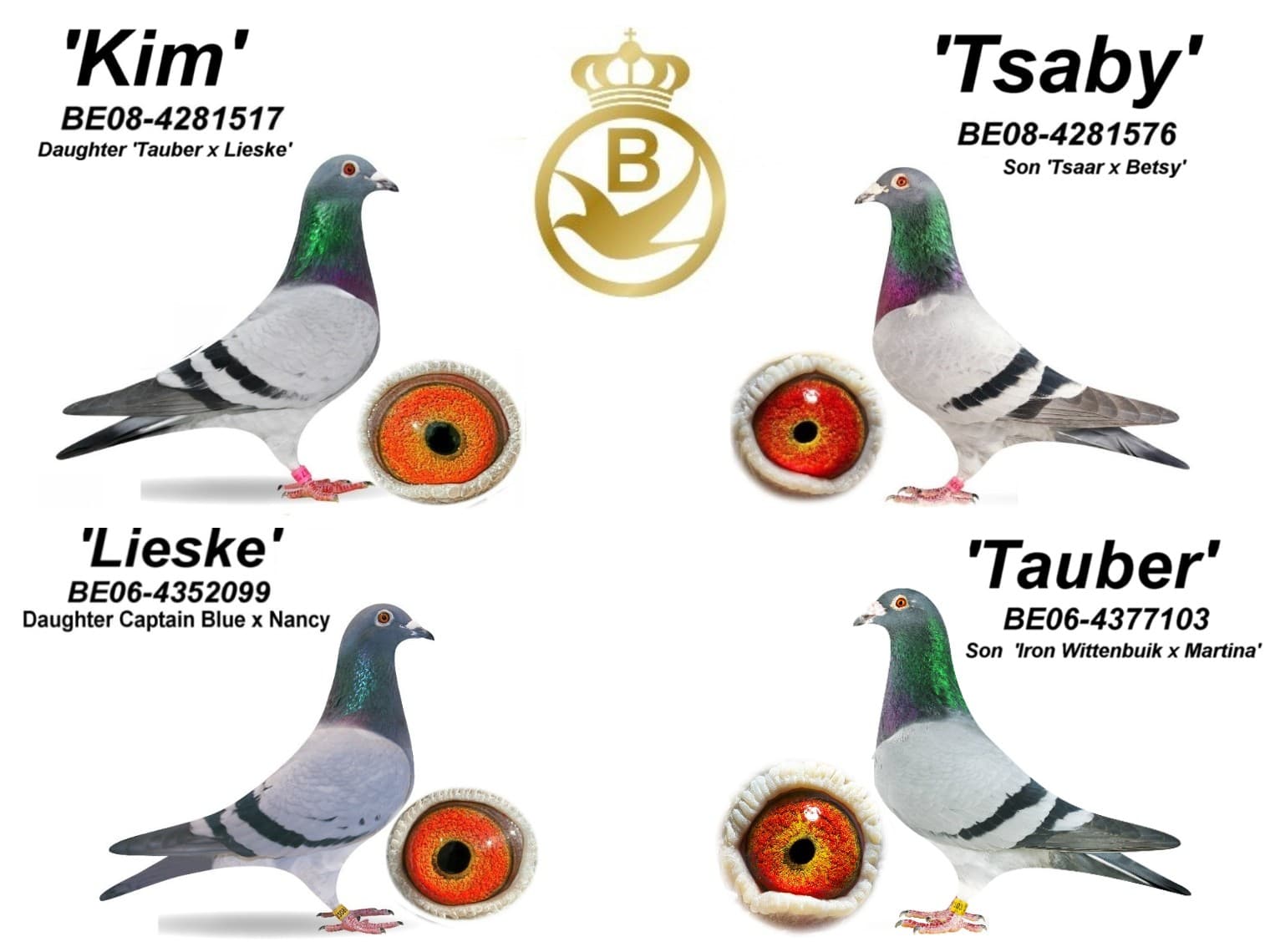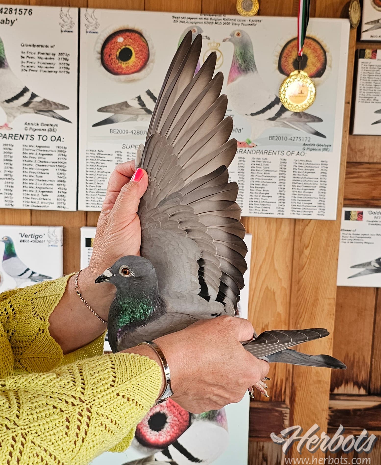 The strain structure of Annick Goeteyn's pigeon colony is largely based on the renowned bloodlines of Gaby Vandenabeele, with no less than 95% of the pigeons coming from this legendary lineage. The core of the colony is built around the well-known lines of "Bliksem" and "Wittenbuik". One of the most important pigeons from which Annick's strain was built is "Captain Blue", a direct son of "Bliksem". In addition, "Nancy", a super breeding hen from Gaby that he bought from Leo De Jonghe, is also a hen that cannot be left out of the successful base of the colony. Below are some of the pigeons around which Annick's colony was built: