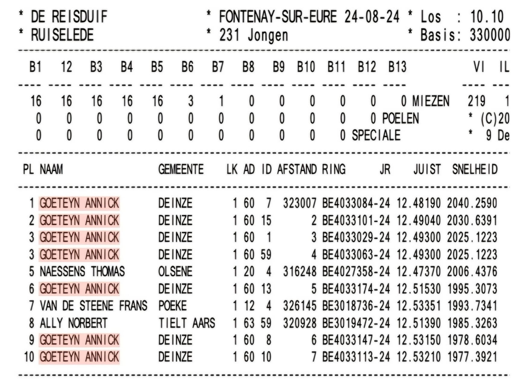BE24-4033084, aka "Little Lucky", is a little hen who has not yet been paired nor has she nested. Yet she seems motivated by the nesting cocks around her, who try to impress her while their hens are on nest. With an impressive speed of 2040 metres per minute, she almost literally raced past her loft. But "Little Lucky" knew exactly what to do to take the win. In total, 25 of the 60 pigeons basketed managed to fly interprovincially in the top-10%.