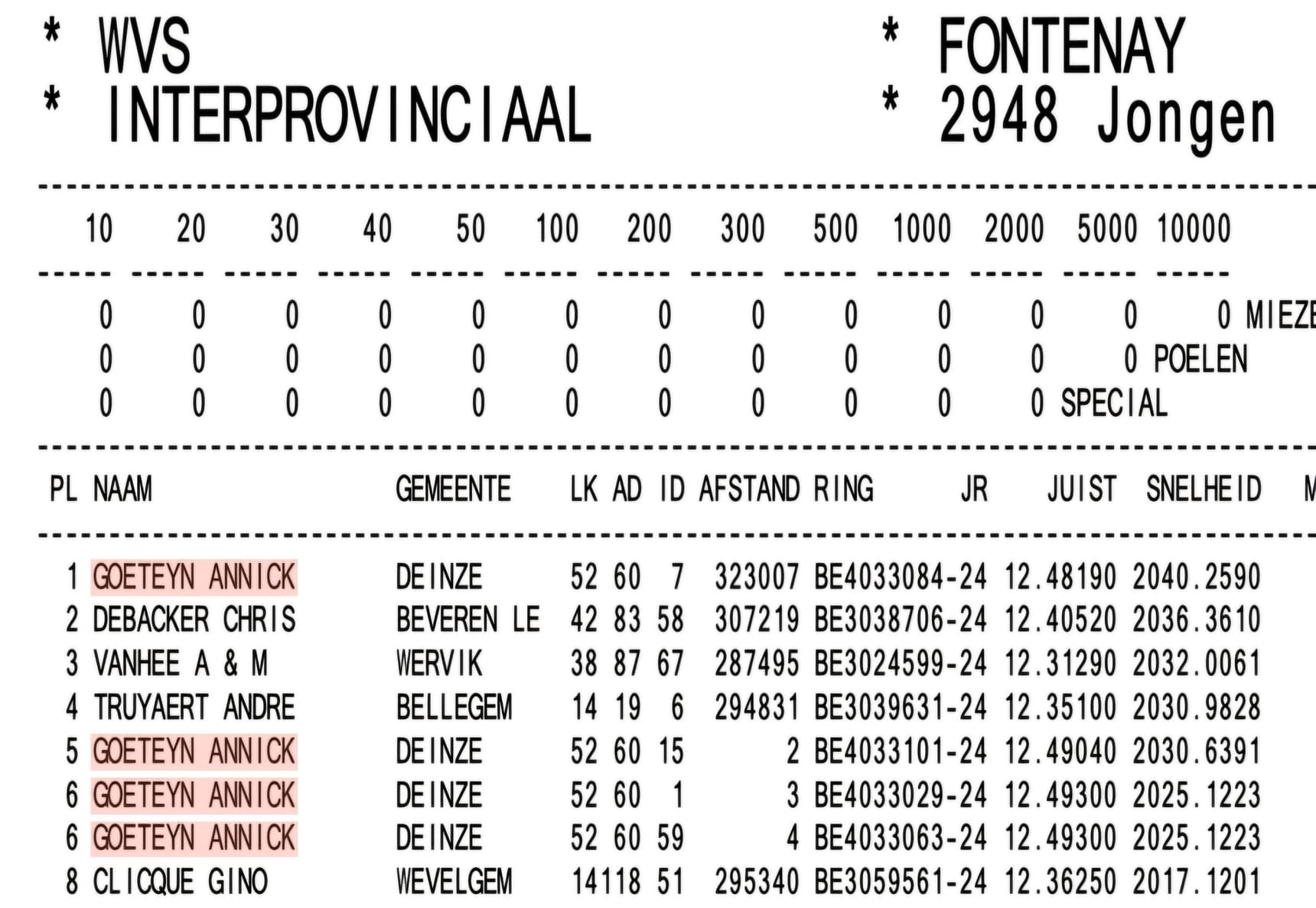 Deinze - It is starting to become a tradition to contact Annick Goeteyn after yet another brilliant weekend for her pigeon colony. Together with her partner Christian, Annick put up another impressive performance last weekend. On the inter-provincial flight from Fontenay, her pigeon "Little Lucky" won the 1st inter-provincial prize against no less than 2,948 youngsters.