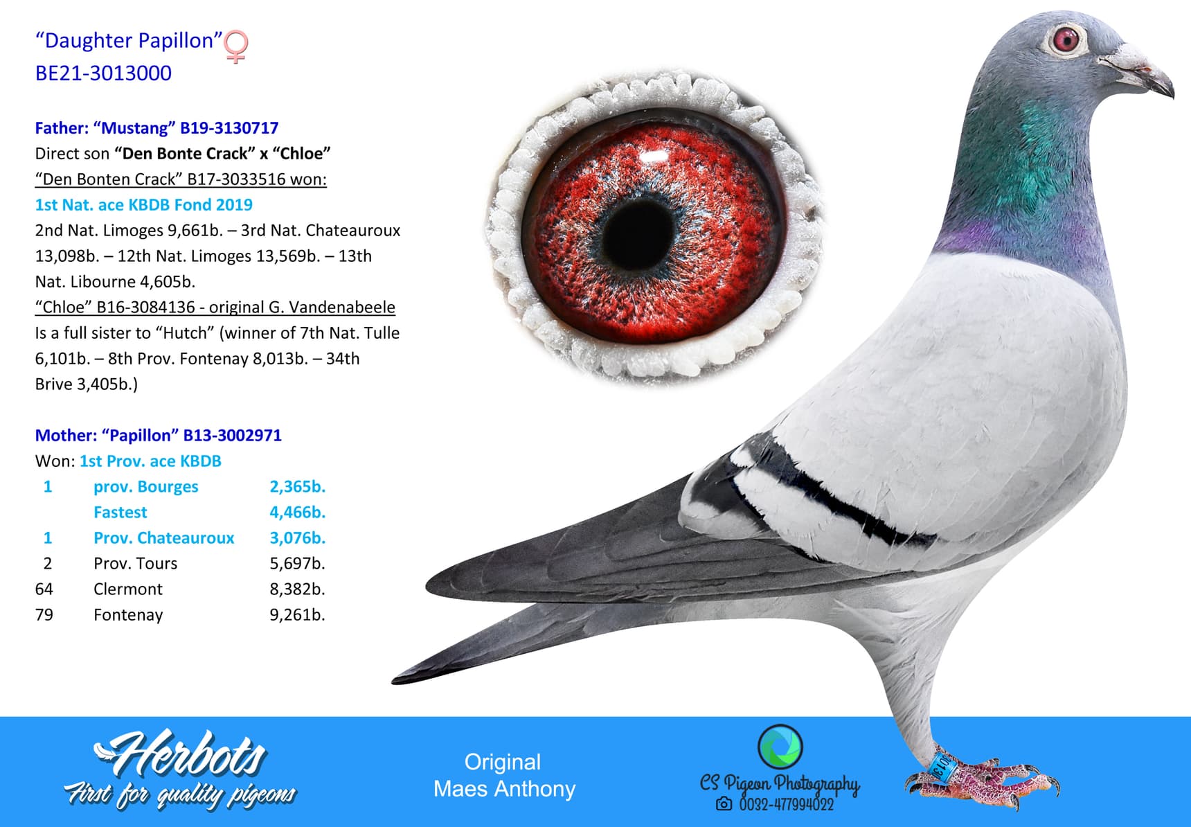 Pappillon' on the father's side descends from "Broer Sonja" (BE04-3144281), a gifted breeder who is, among others, father of the provincial winner 'De Bordeaux'. In his pedigree we see Valère Vandepoele. "Beauty 847" (BE11-3168847) is the mother of this top bird. She has in her veins the noble blood of 'Den Turbo' of Gaby Vandenabeele and 'Sonja' of Charles Matthys.