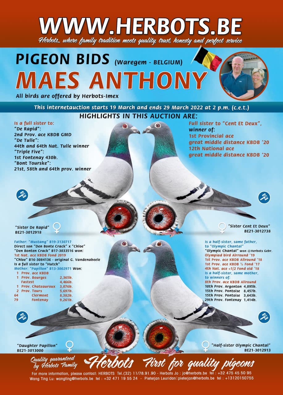 At the moment a unique group of original Anthony Maes pigeons is offered on internet sale Pigeon Bids. Direct children from proven toppers!