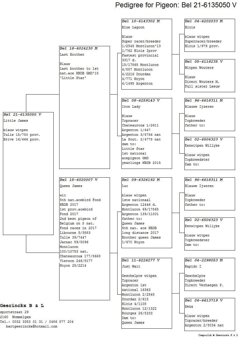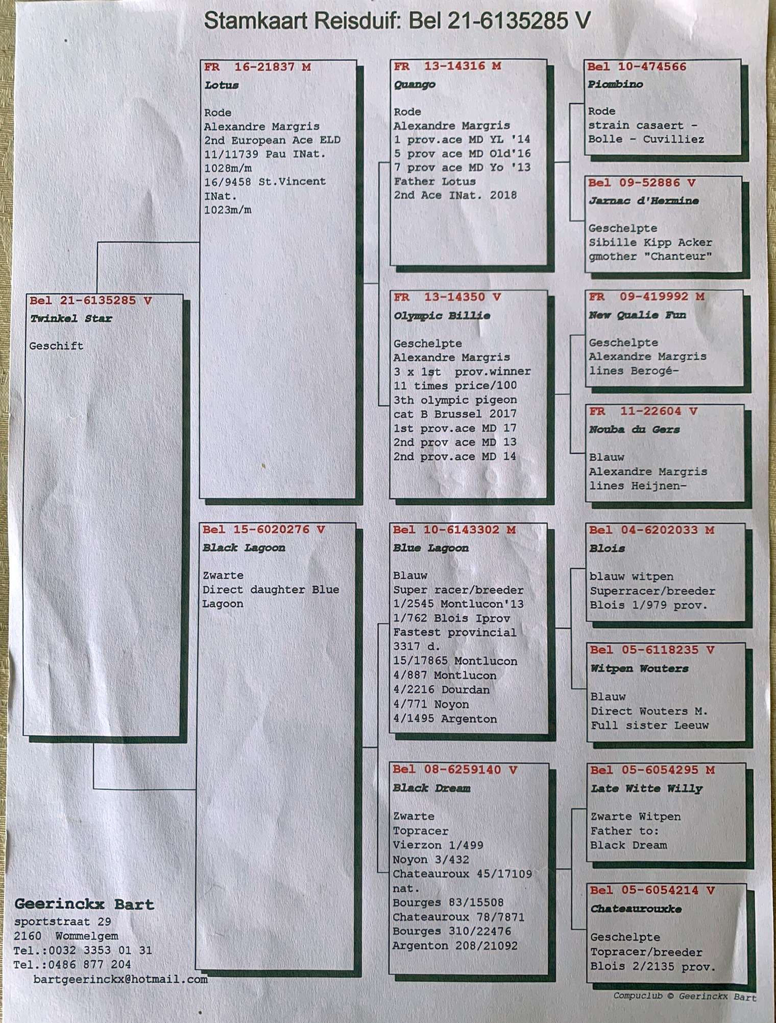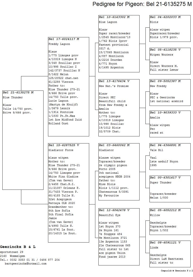 Son of “033/04” Blois won 1 Prov Blois 979p x “235/05” Witpen Wouters ( full sister Leeuw Marcel Wouters )