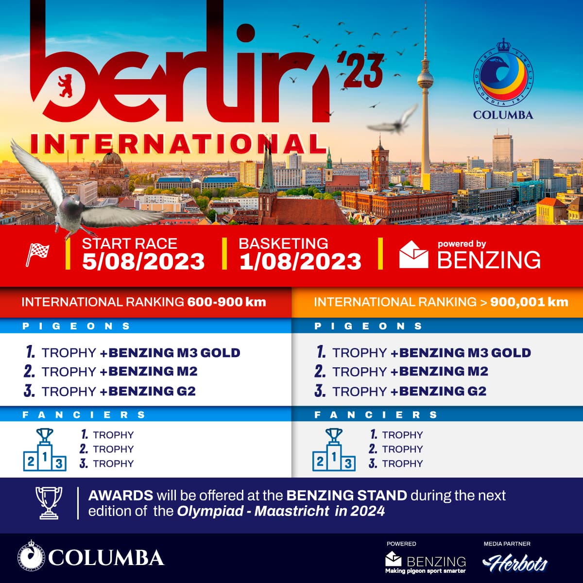 Prizes are offered by Benzing which will reward with trophies the first 3 pigeons and the first 3 fanciers on the 2 international rankings! The first 3 pigeons will receive a Benzing watch!