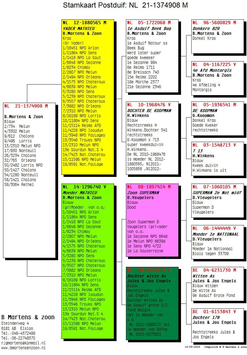 Son of “NL 068/05” Checkered won 1st Sezanne 994p – 6 Reims 1,711p – 15 Reims 2,202p – 18 Marche 2,377p – 21 Sezanne 2,346p x “NL 476/10” Daughter Koopman Cock x H.Winkens