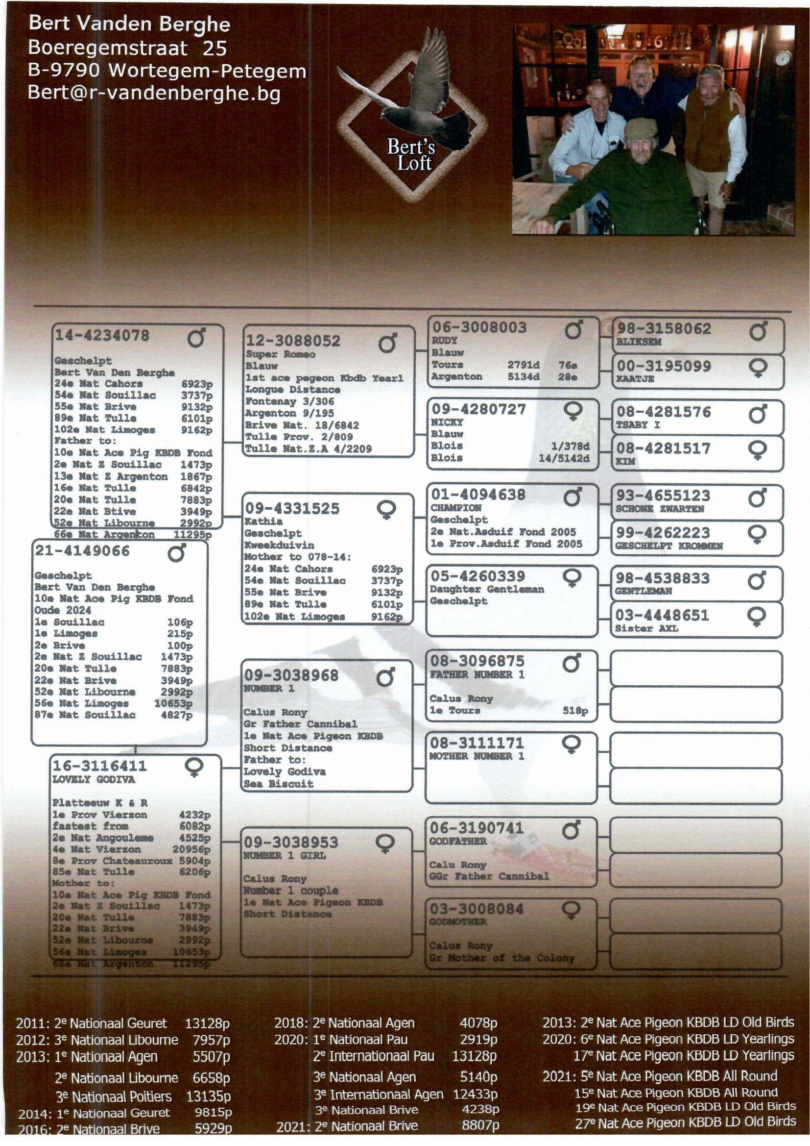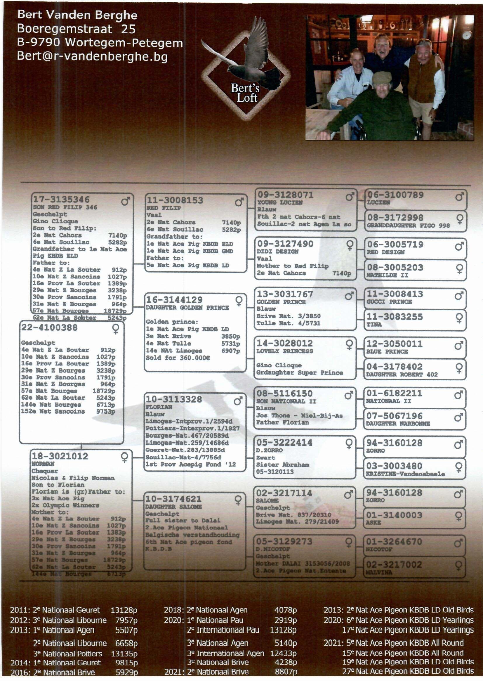 We can present here a dozen top pigeons that regularly fly in the national top and this both hens and cocks. Also, as with everyone, ‘heroes or heroines’ die here on the field of honour. For instance, the 2 best hens (Olympiad...) were lost in the battle this year. Pigeons that more than repeatedly flew in the national top in all weather and conditions did not return.  Pigeon racing can provide much virtue but also painful and awkward moments. But where quality is present other names stand up and step to the fore, so too with Bert.