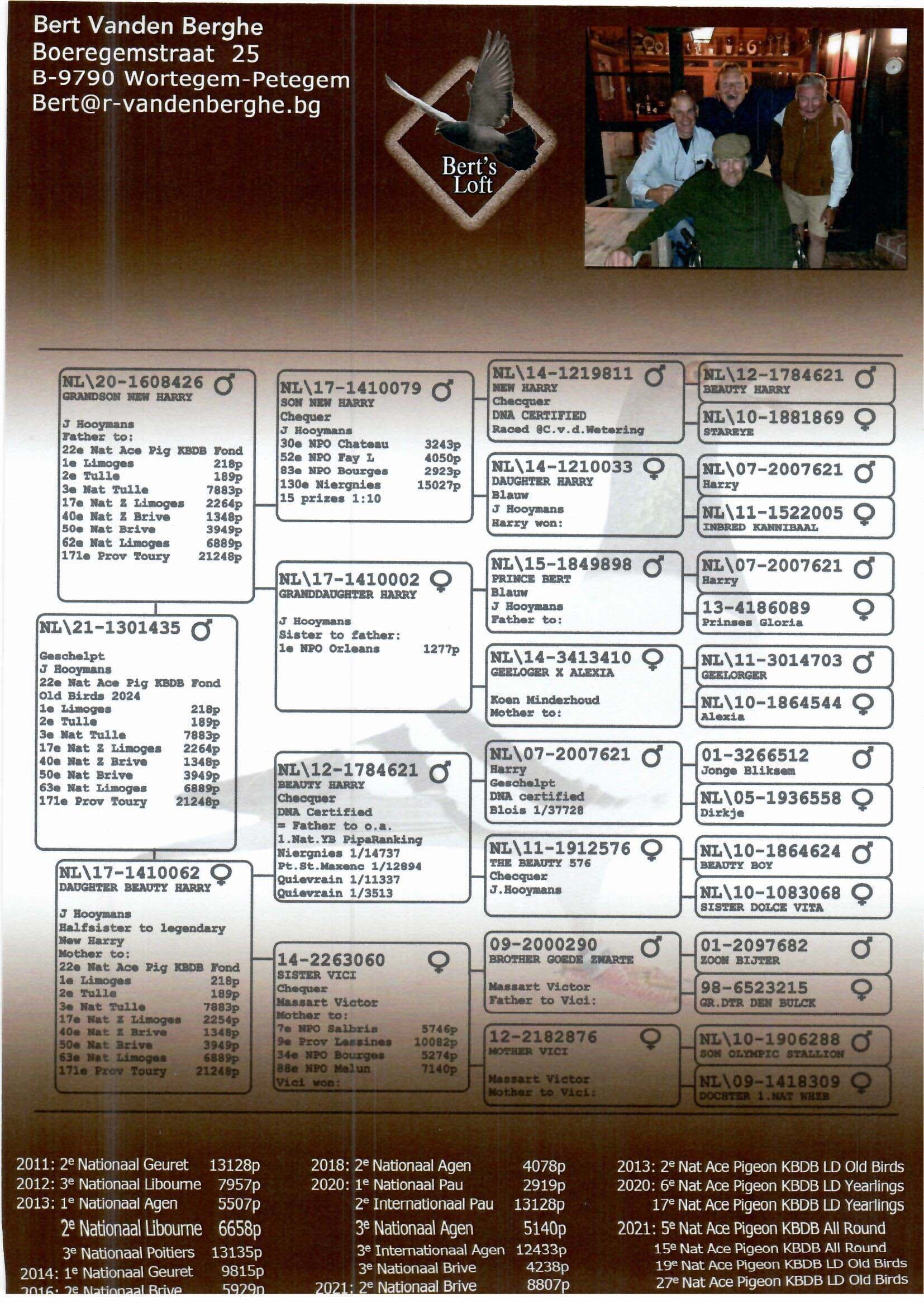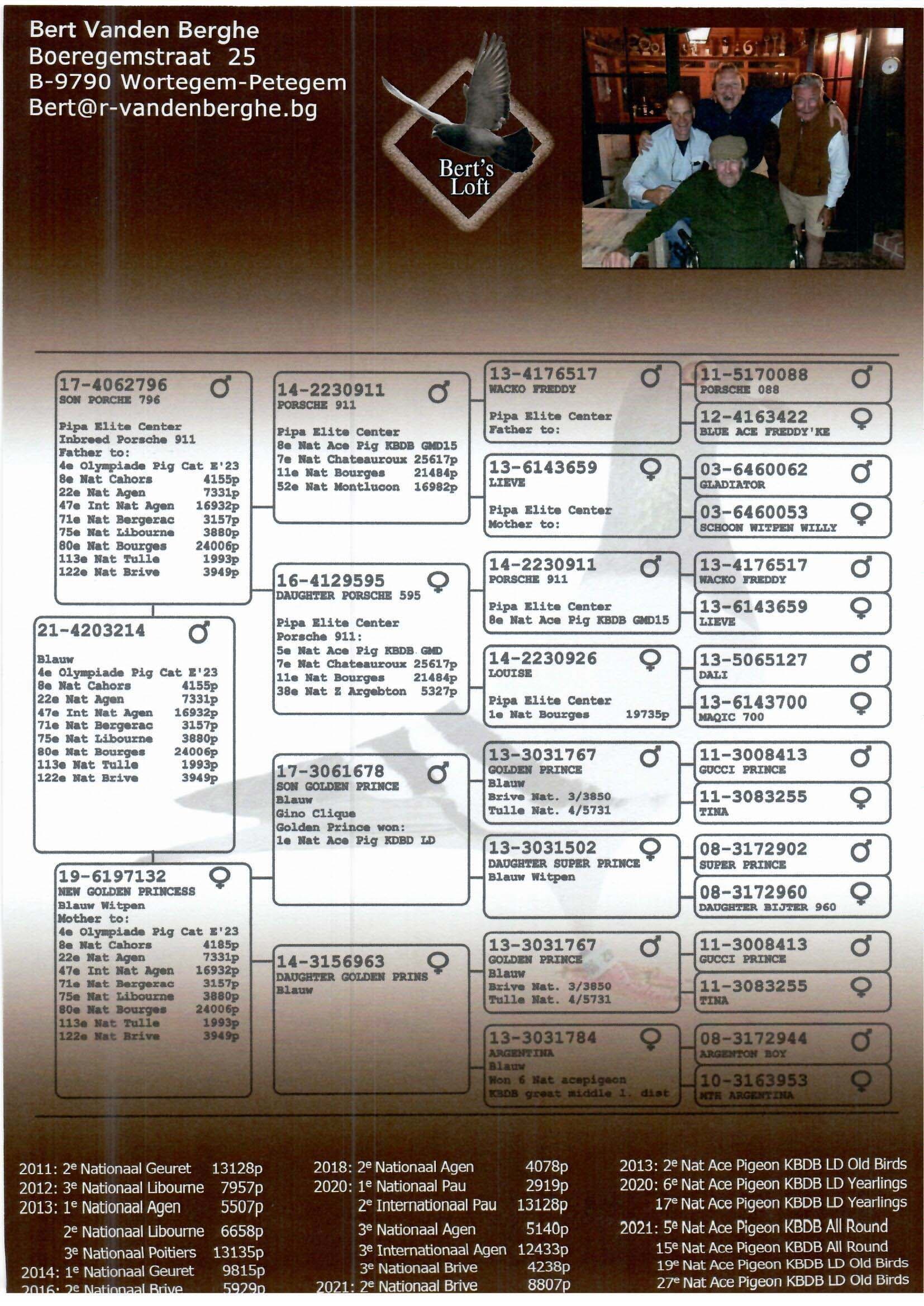 As can be seen in the pedigrees, the strain is a combination of Bert's own breeding pigeons braided from his own pigeons and also pigeons from Jan Hooijmans who are doing very well here.