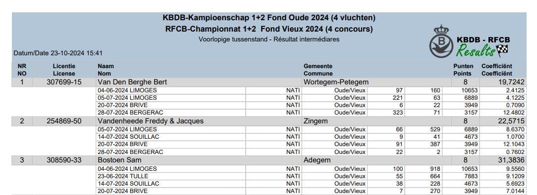 A lot can be analysed about it but in the end there is always someone who with his 2 first drawn over 4 long distance races manages to put down the sharpest coefficient...and in the 2024 season this is Bert Vanden Berghe from Wortegem-Petegem, who, flanked by his caretaker Bart, may raise this trophy.