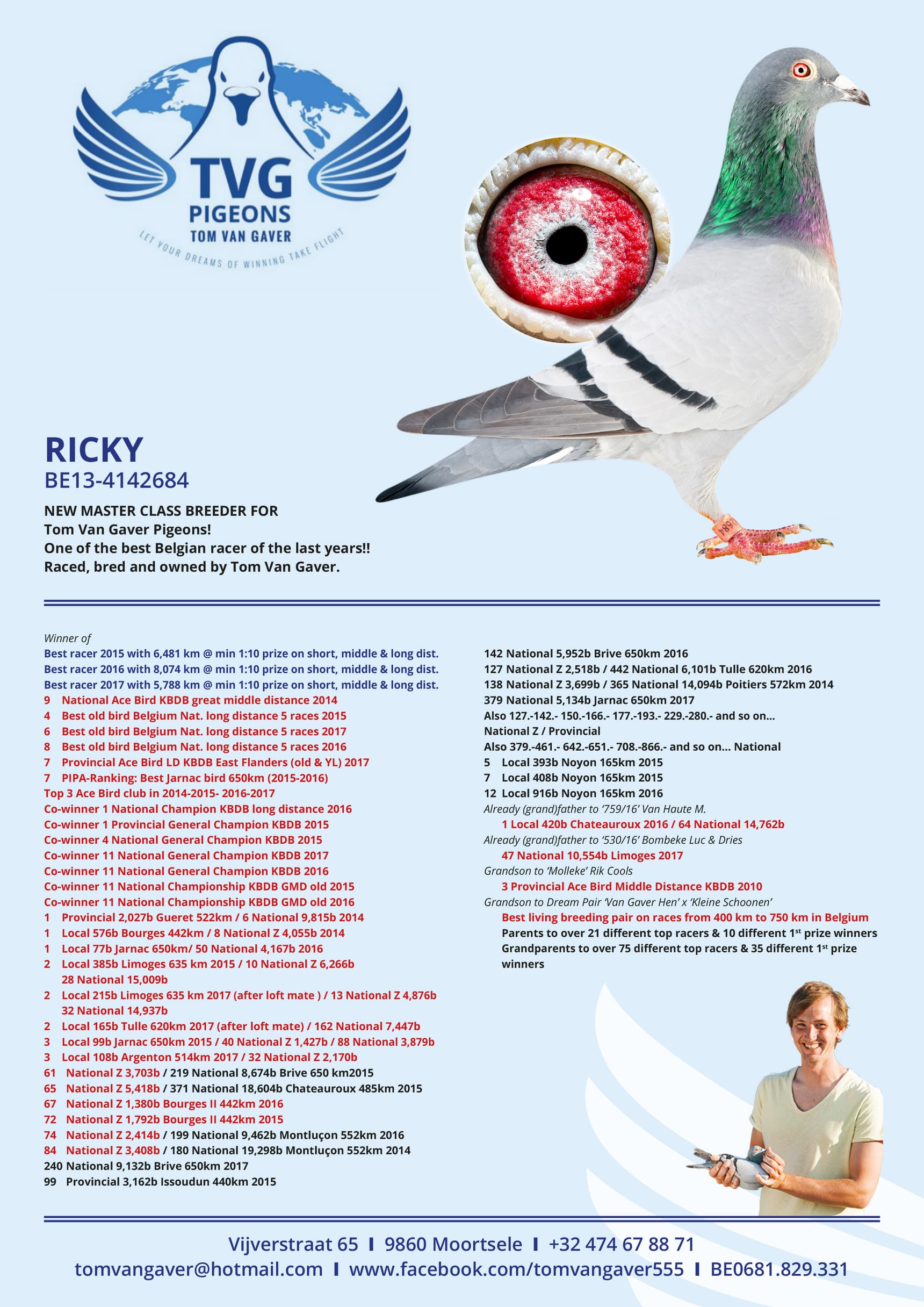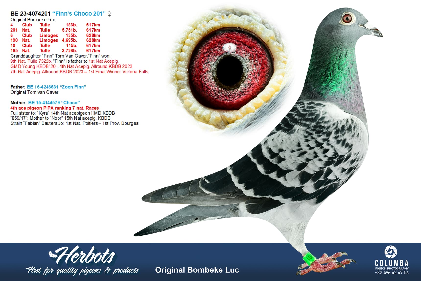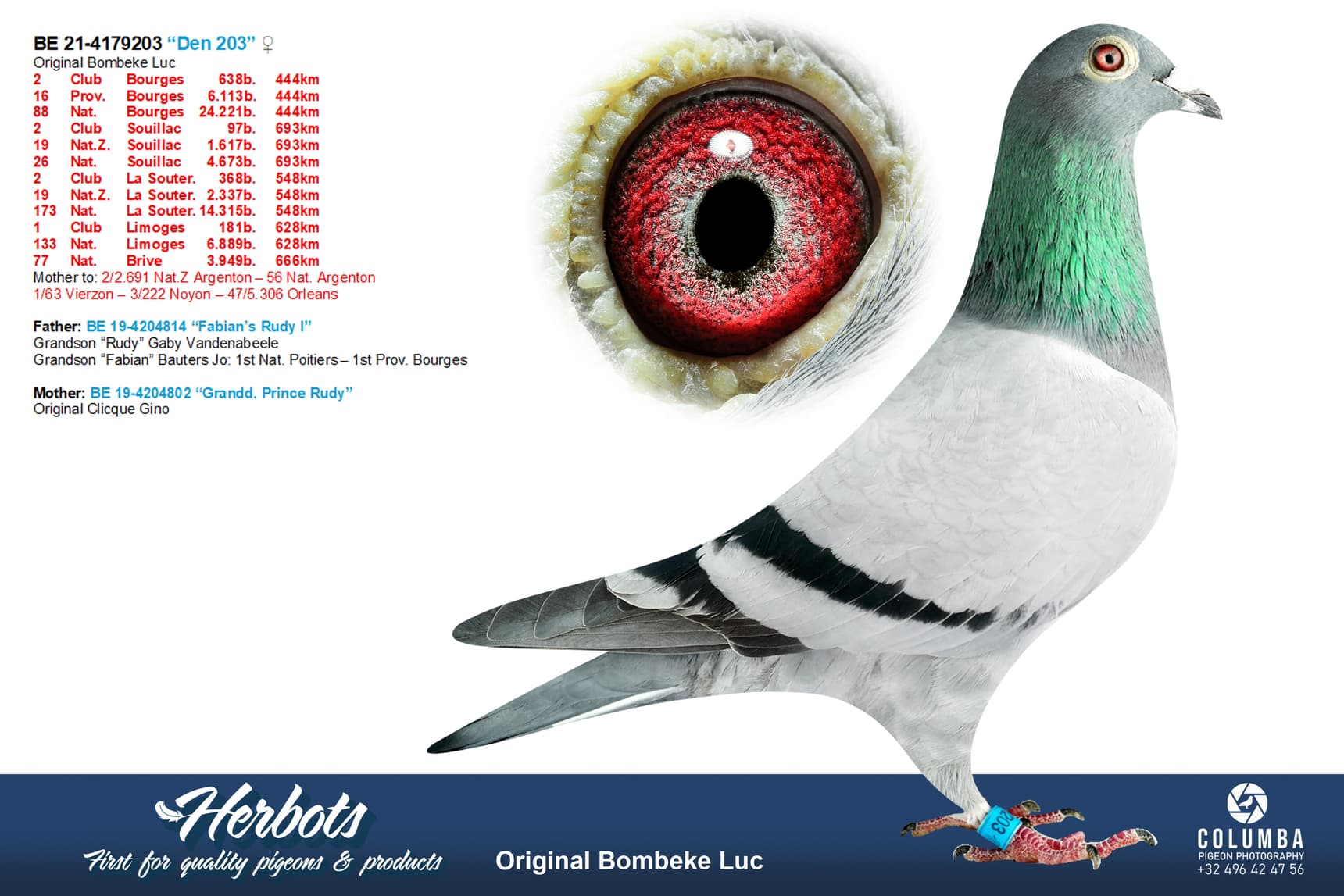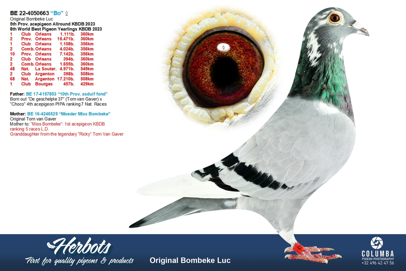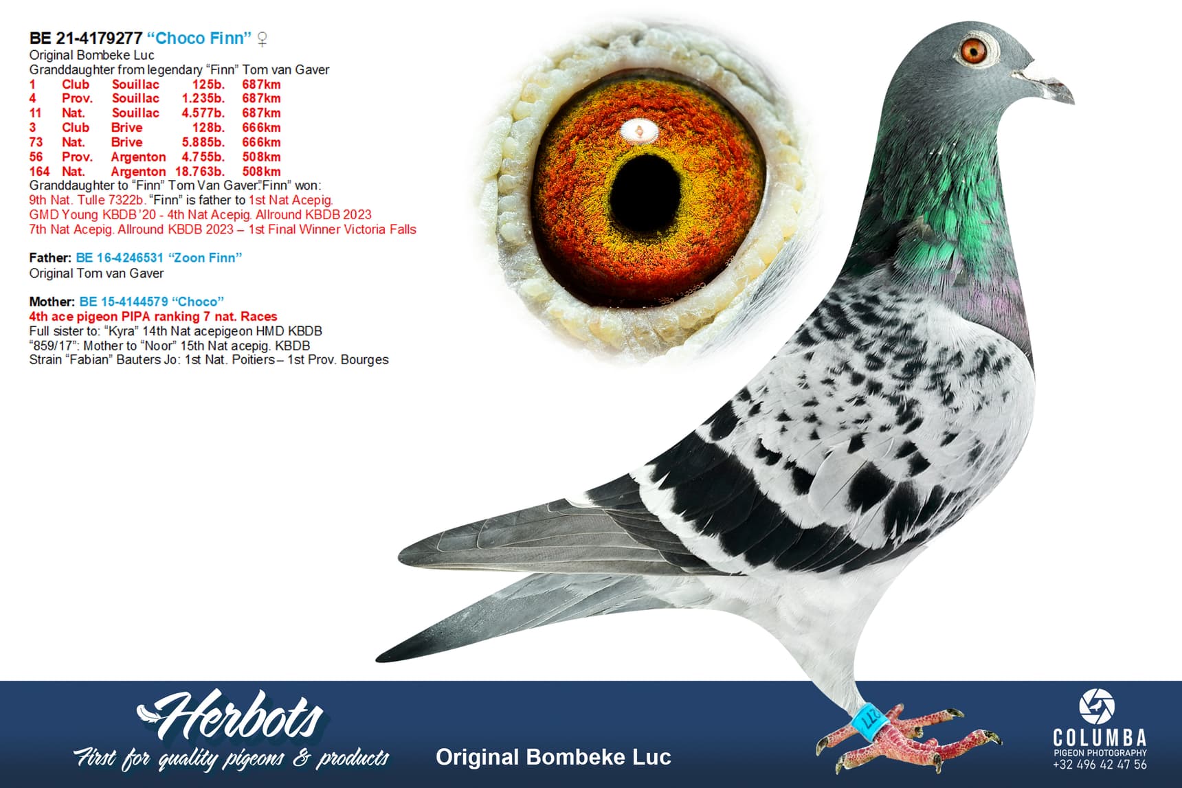 With 10 prizes 1/100, 3 first prizes, and the genes of the super breeder "Ricky" in her blood, she is one of the showpieces in this auction. She is also a half-sister of "Miss Bombeke" at Tom van Gaver.