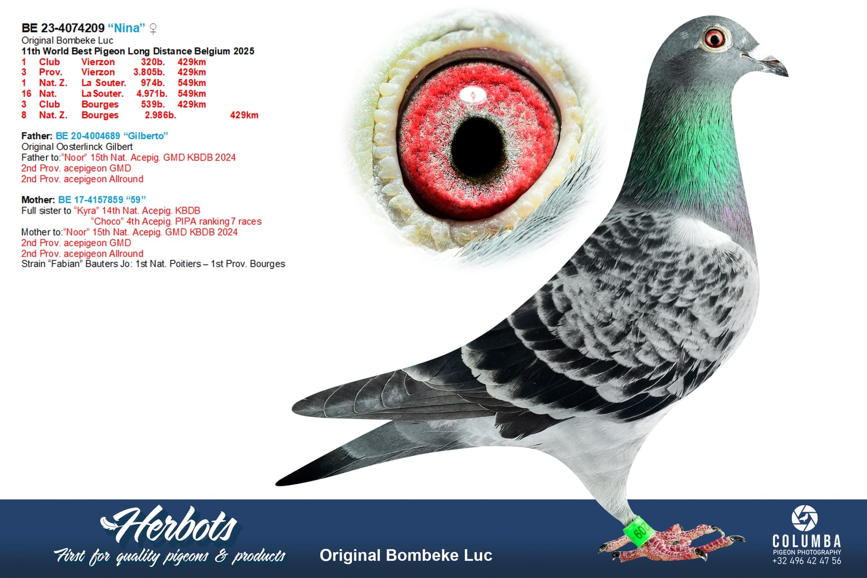 The dam of this pigeon comes directly from Bombeke Luc & Dries, and she is a full sister of Lot 8 and a half sister of Buy 2+4+7.