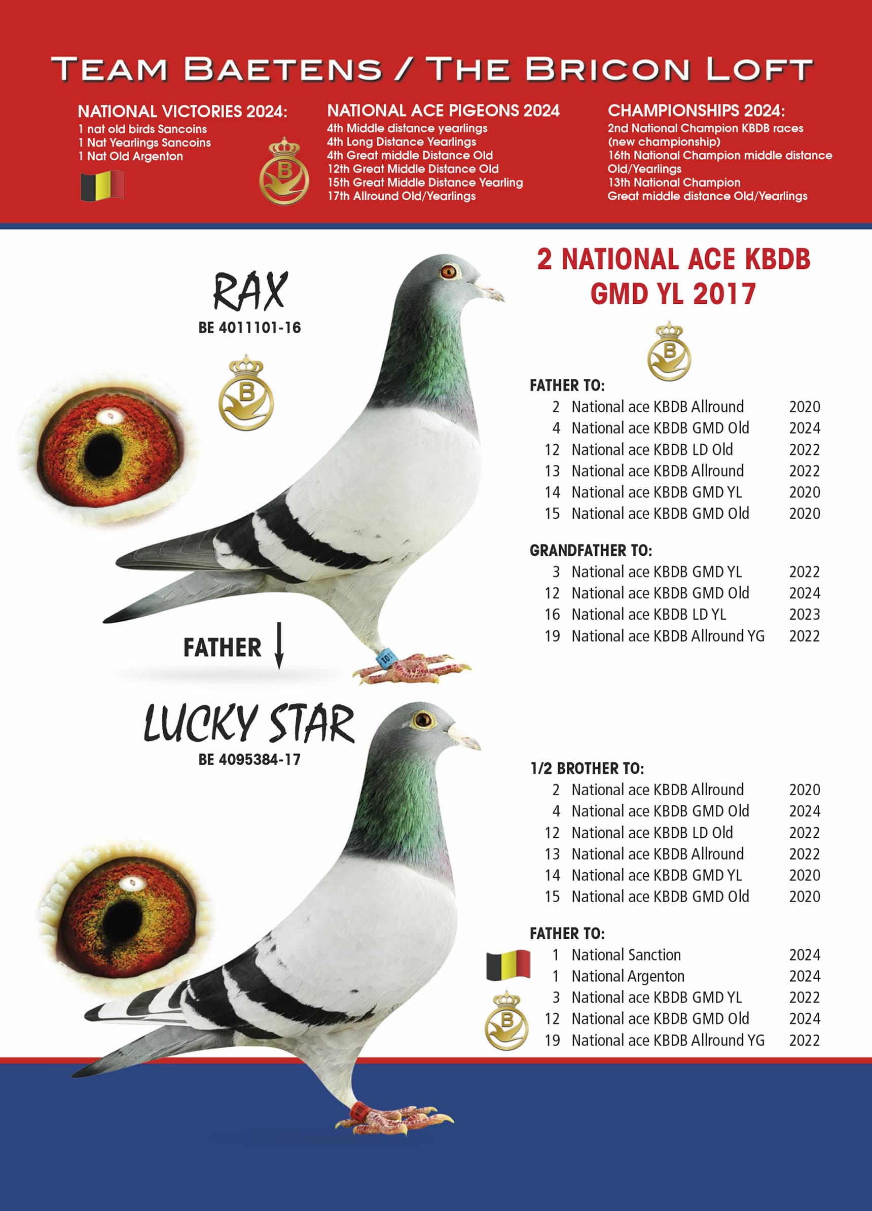 Because Dries is employed by BRICON, additional valuable blood was purchased from Team Baetens: pigeons came from Team Baetens, including a brother of the 5th National Ace Pigeon '214' and children of RAX, 2nd National Ace Pigeon.