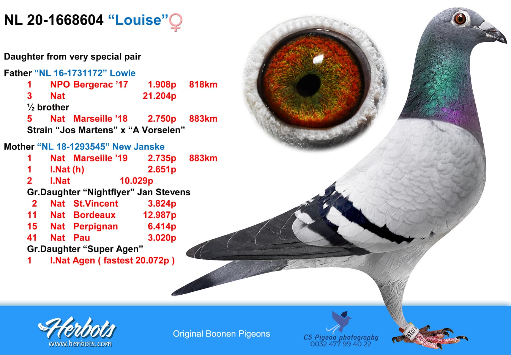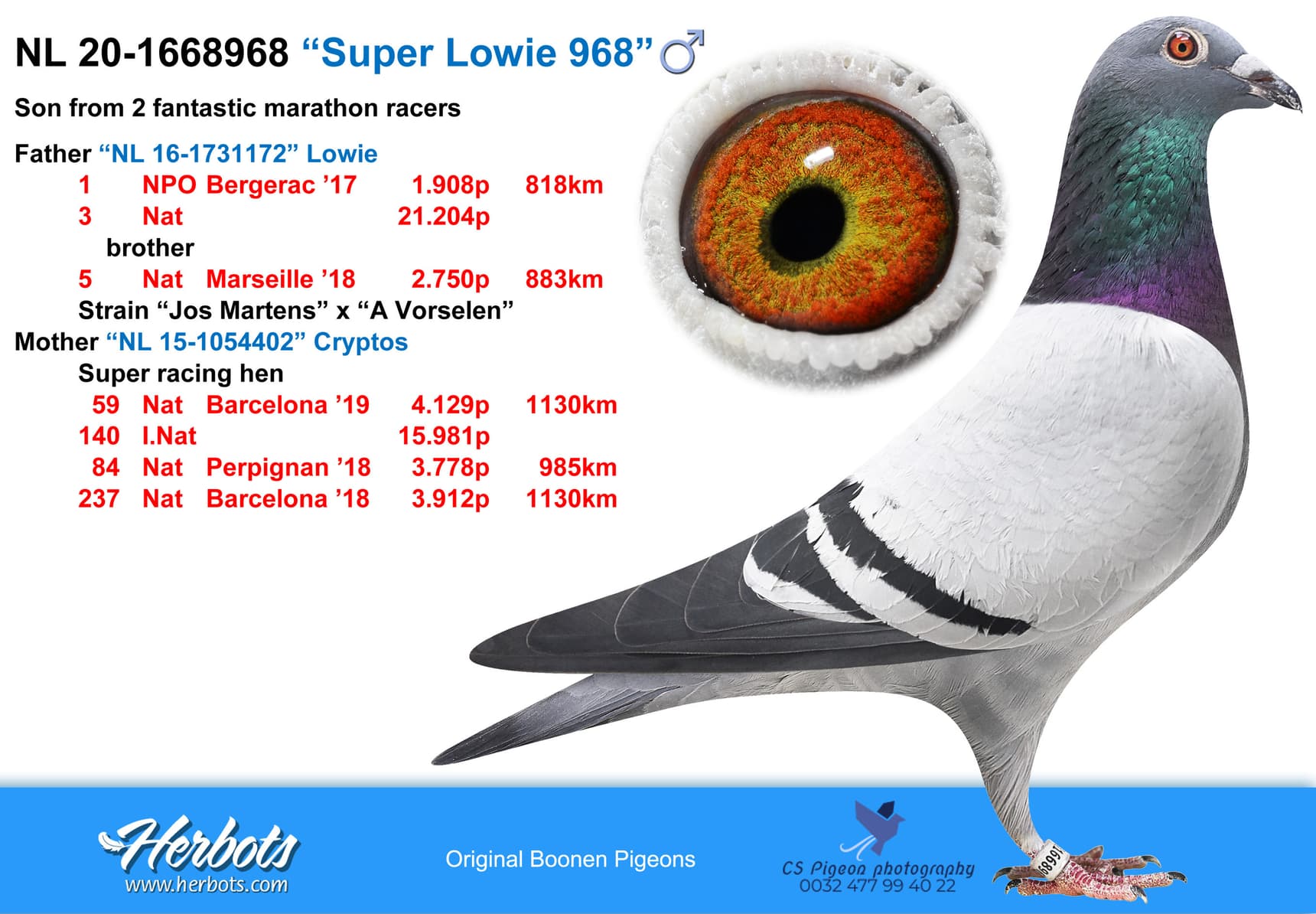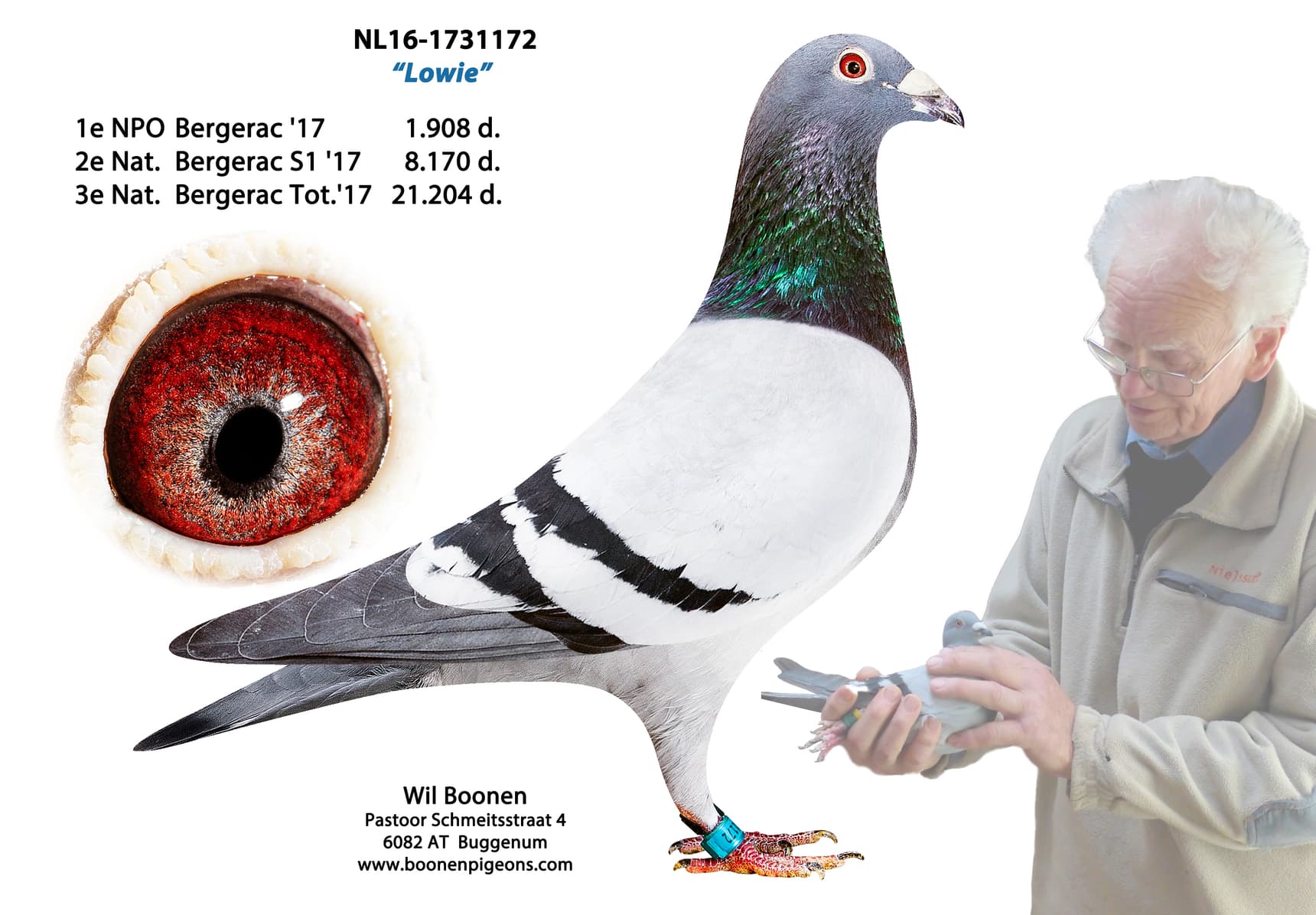 In 2017 they won with NL 16-1731172 Lowie the 1st NPO Bergerac against 1,908b over a distance of 818km. He also won 3rd National Holland against 21,204 old pigeons. Also he is out of a family of top pigeons as his full sister wins in 2018 the 5th National Marseille against 2,750 old pigeons.