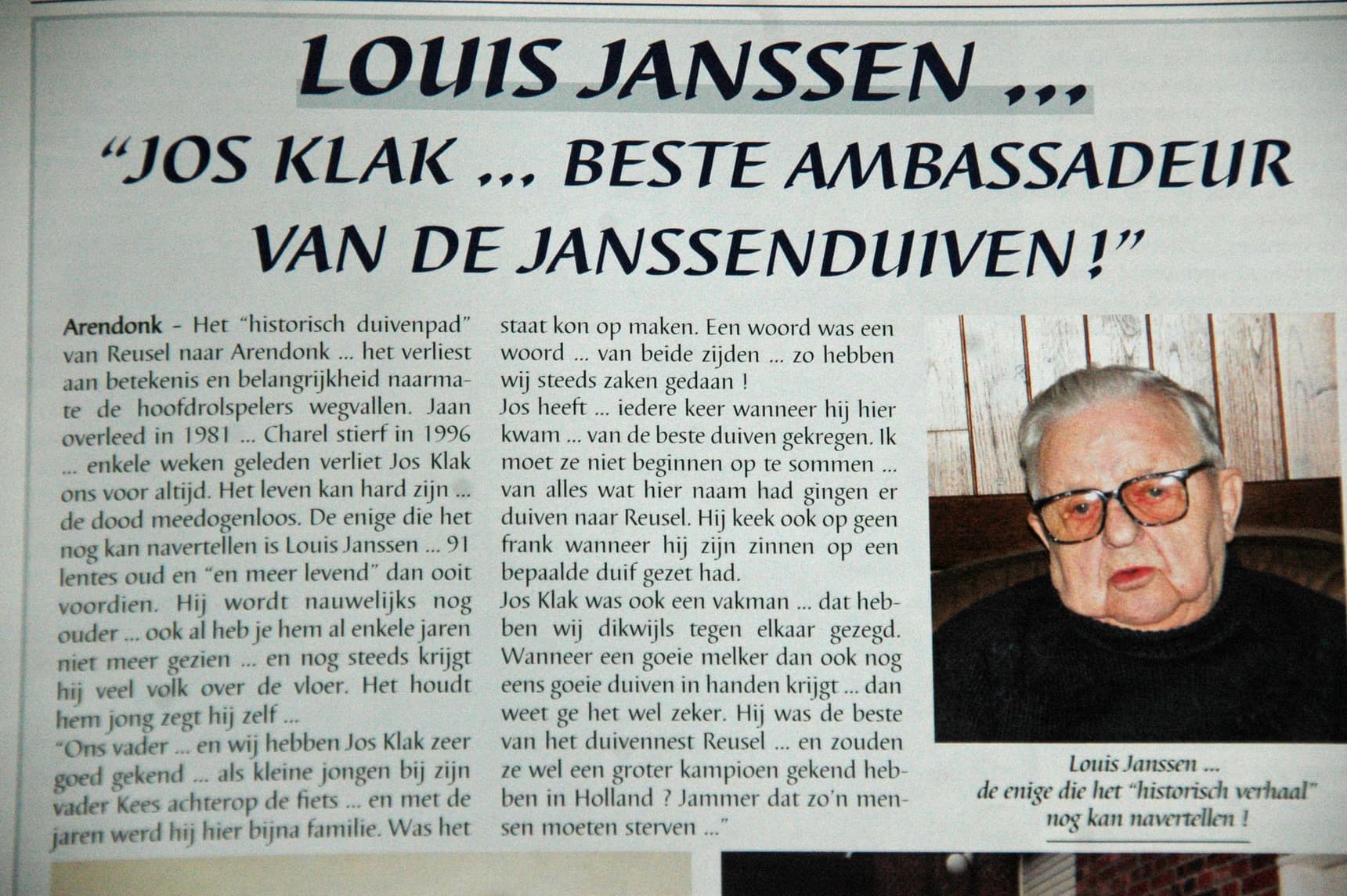 Because keeping pigeons was outlawed during the Second World War, Jos had to start from scratch afterwards. His mother insisted he approached the famous brothers from Arendonk. After all, his father was always treated correctly there and he achieved great successes with their pigeons. Jos never wanted any other pigeons afterwards than those of the Janssen brothers. Not because all the other pigeons were bad, but they certainly weren’t better.The medium distance flights were Jos’ greatest passion in all his life, he was less interested in other races. He created a type of pigeons that was inimitable for medium distances and which were fast enough for the short jobs and tough enough for the single-day races. The watchword of Jos was: work with a good pedigree, eliminate inbreeding, race a lot and select strictly. Because of that it might happen when you study a family tree of a random recent Klak pigeon, you can encounter cracks of old times like the ‘881 van ‘47’, the ’43-duif uit het Jong Koppel’, ‘Vechter x Witpenneke’ or the ‘613’!