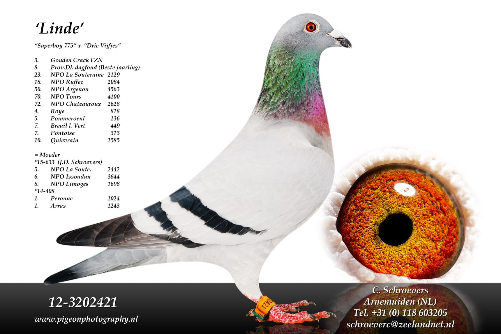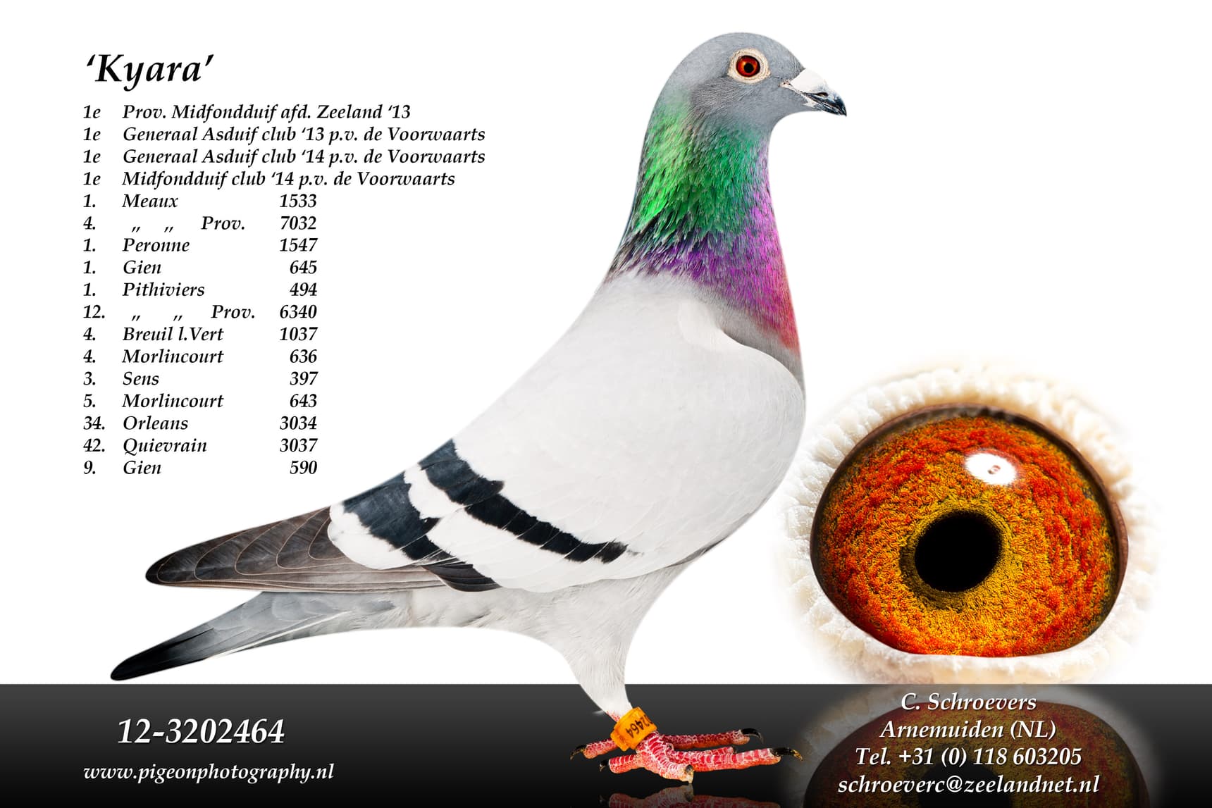 “Kyara” is a direct daughter to “083-Son Superboy” x “Nova”. “083-Son Superboy” (NL11-3007083) won 1st Pithiviers 379b. – 5th Prov. 5,015b. – 2nd Breuil 1,144b.- 2nd Breuil 971b. – 15th Peronne 1,547b. – 29th Peronne 8,568b. . He is a son to base breeder “Superboy 775” (3rd prov. Ace bird Middle distance – 6th Nat. ace bird TBOTB ) x “Dream Lady” (won 3 x 1st - 12th , 20th , 37th , 41st , 47th , 56th , and 62nd NPO). Mother to “Kyara” is the classful hen “Nova”. “Nova” (NL14-3406432) won 42 prizes 1/10 – 11 x 1/100 and became 3rd Provincial Ace bird middle distance. On her palmaris you find 3 x 1st prize – 5th Niergnies 7,207b. – 7th Roye 9,328b.- 14th Peronne 1,527b. – 16th Fontenay 3,705b. – 34th Roye 9,498b. – 40th Arras 8,545b. – 62nd Pont 9,148b. – 64th Pont 9,062b. and so on. She is a direct daughter of the before mentioned base couple “Azelio” x “Drie Vijfjes” . So you can state that “Kyara” is the granddaughter to 4 superior base pigeons which form the current Schroevers colony.
