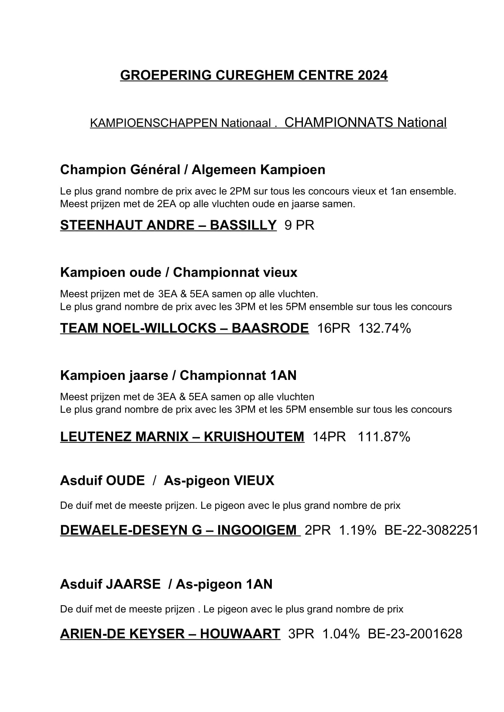 The Grouping Cureghem Centre champions' party will be held on 1 December at the "Den Boomgaard" hall in Wolvertem-Meise.
