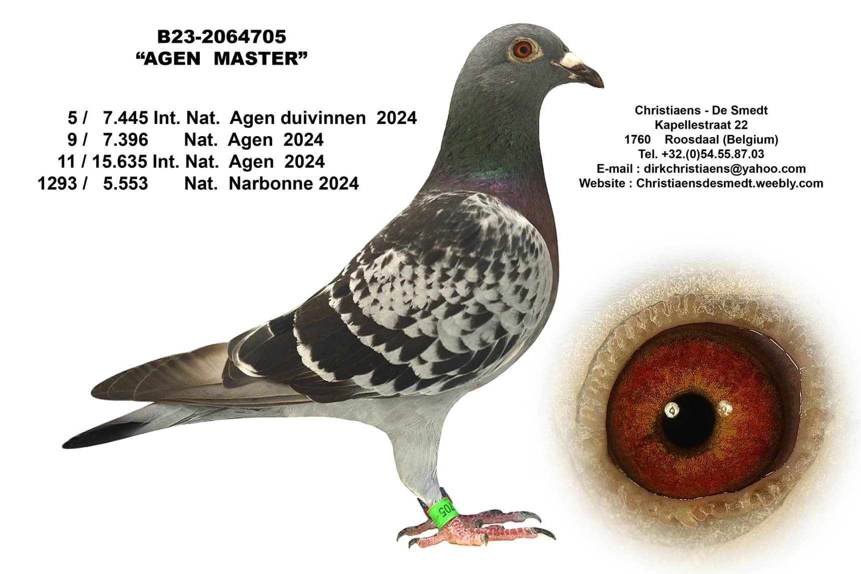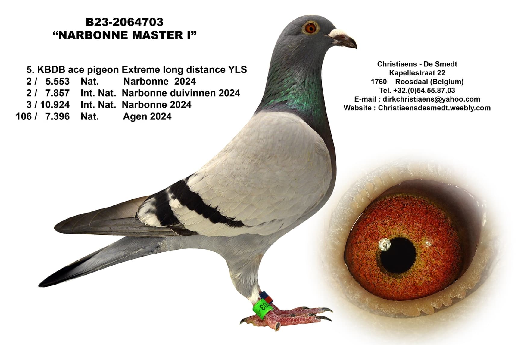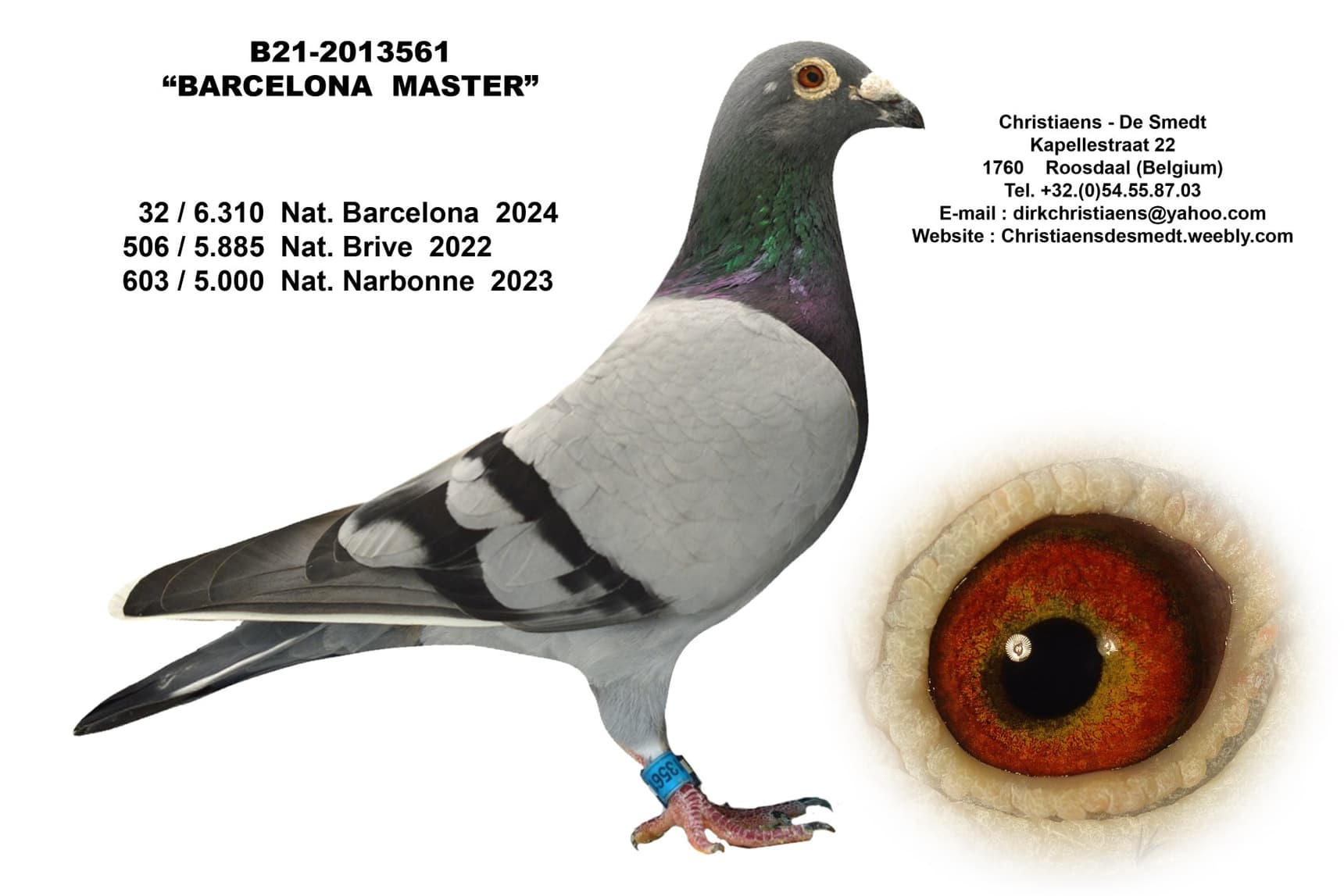 A daughter of “Barcelona Master”, Dirk's first pigeon at the 2024 edition of Barcelona and good for 32nd National Barcelona of 6,310 pigeons, which was coupled here with a topper of the yearlings that won 13th Provincial Agen of 855 pigeons.
