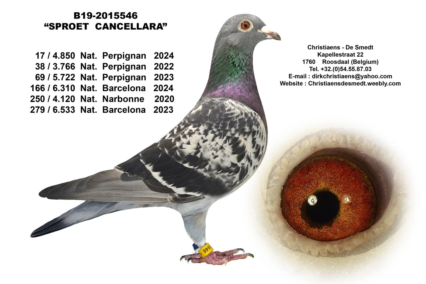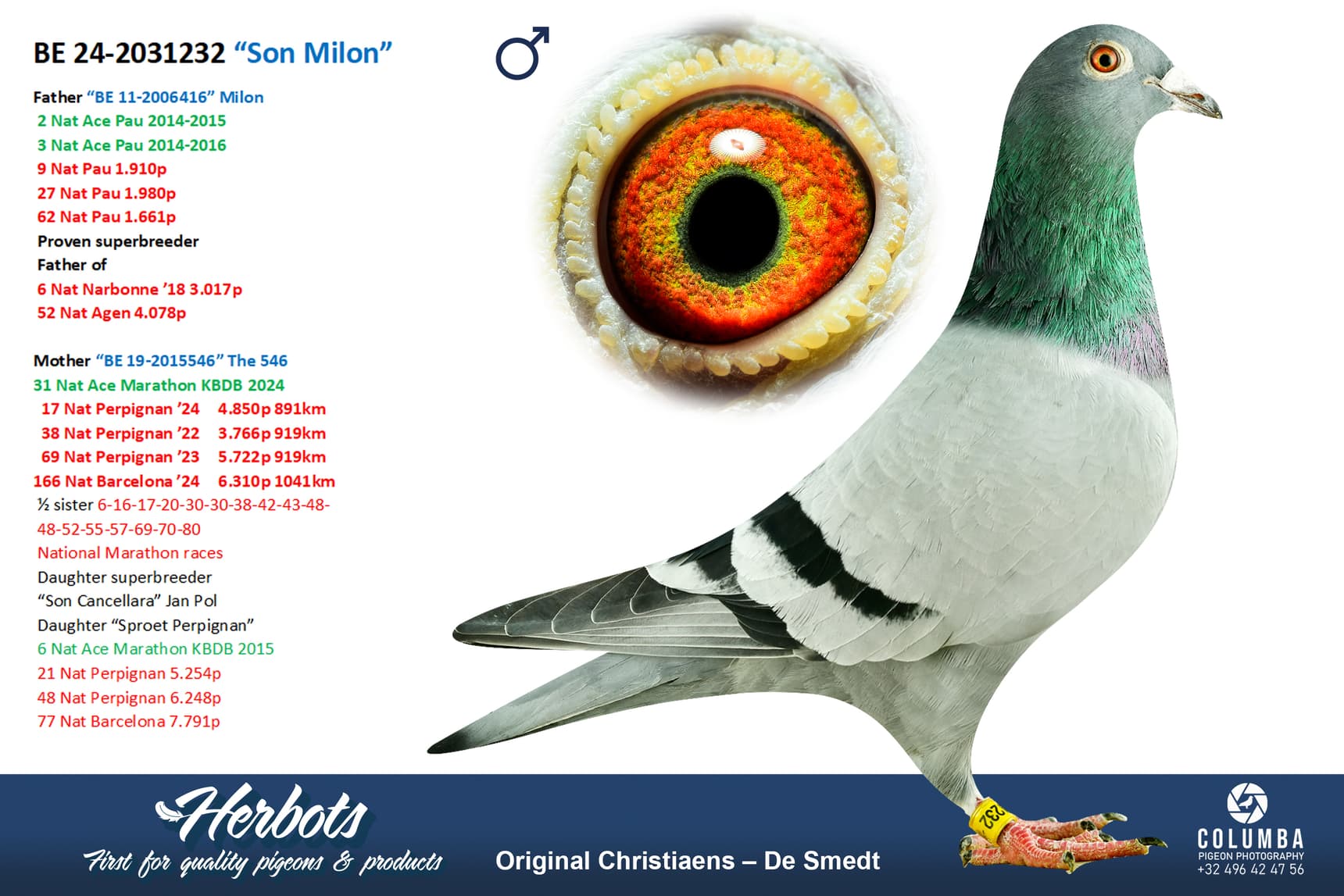 This is a son of old stock breeder “Milon” who himself shone 3 x from Pau with the worst result being a 62nd National who was coupled here with “The 546”. One of the best Perpignan pigeons in our country of the past 3 years with 17 + 38 + 69 National and also 166 National Barcelona. She is a daughter of super breeder “Zoon Cancelarra” who is the father of 20 x TOP 100 National.