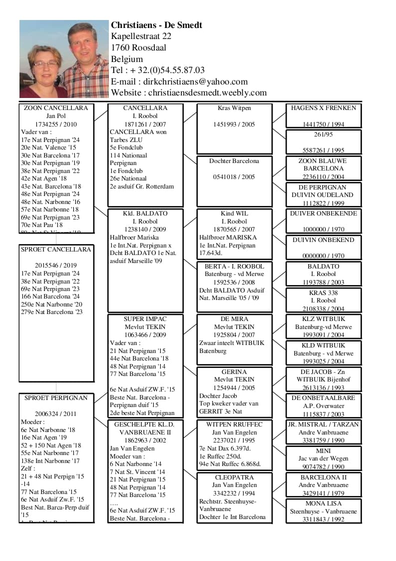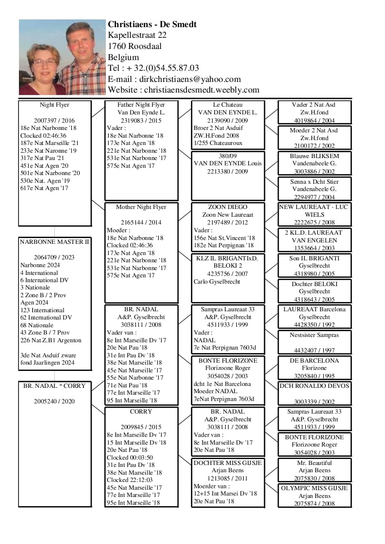 Daughter of “BE 10-709” Ed – De Clercq – Vervaeren is father of “Frans” 1 Nat Perpignan x “BE 16-119”