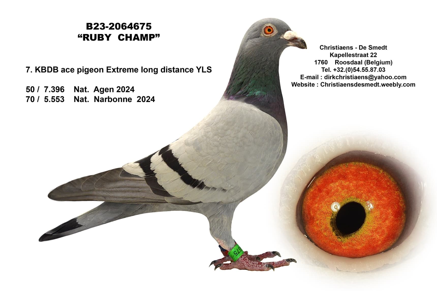 A daughter of again 2 proven top racers, her mother is “Ruby Champ” 7th National Ace Pigeon extreme long distance KBDB 2024 x “The 653” who won 82nd National Agen of 7,396 yearlings.