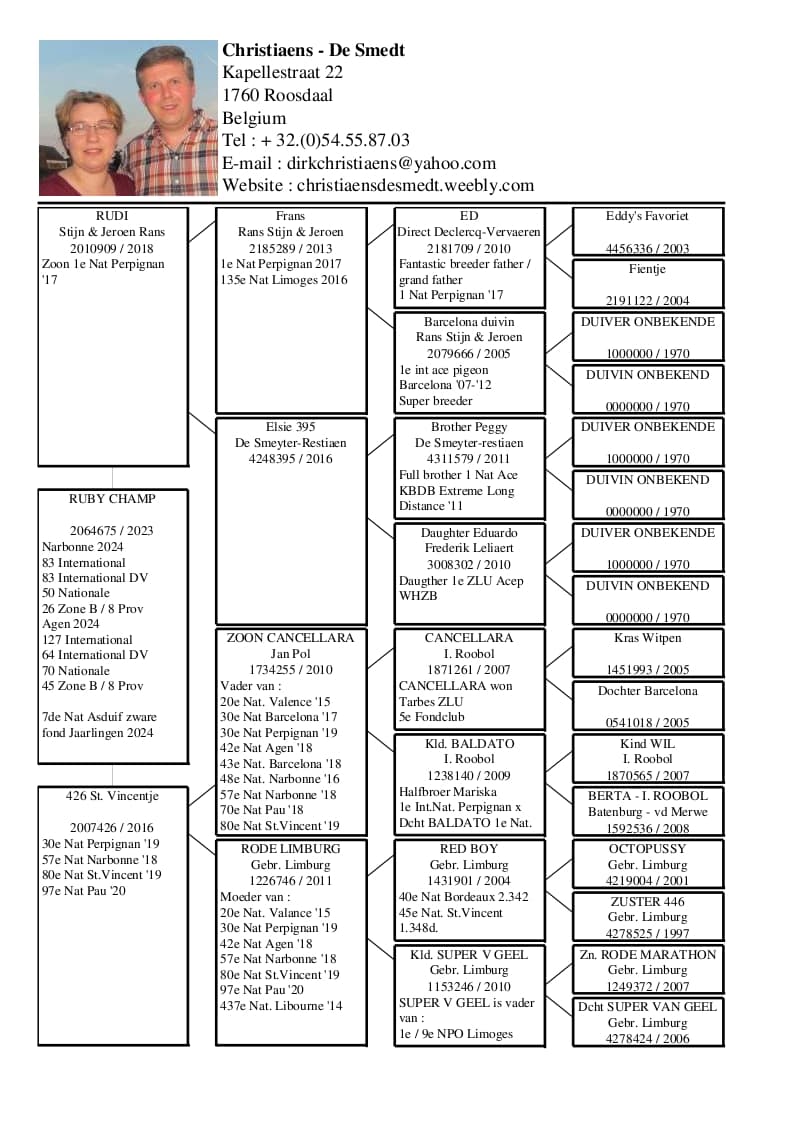 Son of “BE 13-289” Frans 1 Nat Perpignan x “BE 16-395” Elsie 395 De Smeyter – Restiaen