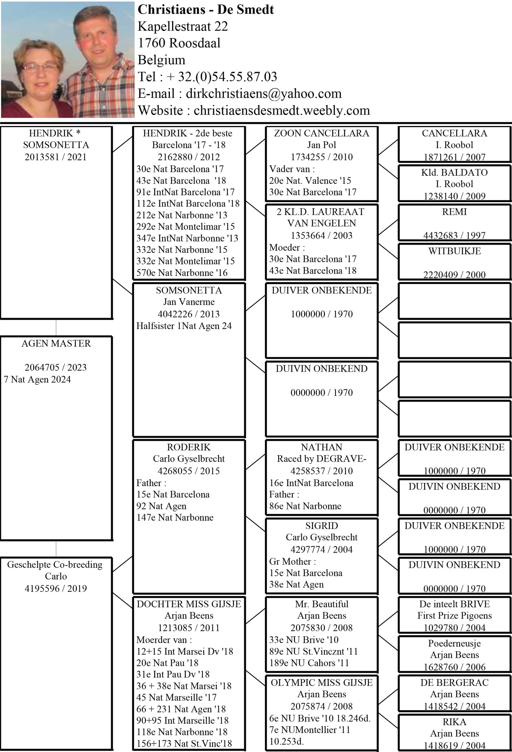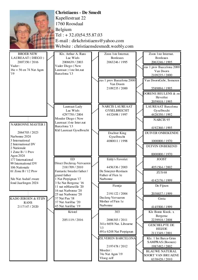 Son of “BE 03-639” Grandson Arthur Alex Rans x “BE 04-750” Laureaat Lady is granddaughter “Laureaat Barcelona” Gyselbrecht
