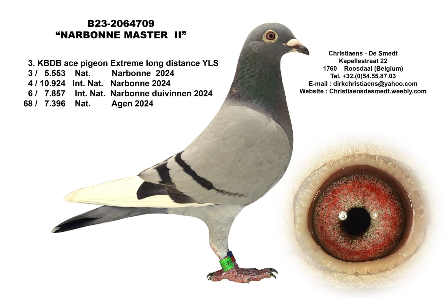 This is a son of “Narbonne Master 1”, 5th National Ace Pigeon Extreme Long Distance KBDB 2024 coupled with the promise that Dirk believes in very much. He now flew 117th National Barcelona in 2024 and is a son of the foundation mother “Daughter Miss Gijsje” of Arjan Beens