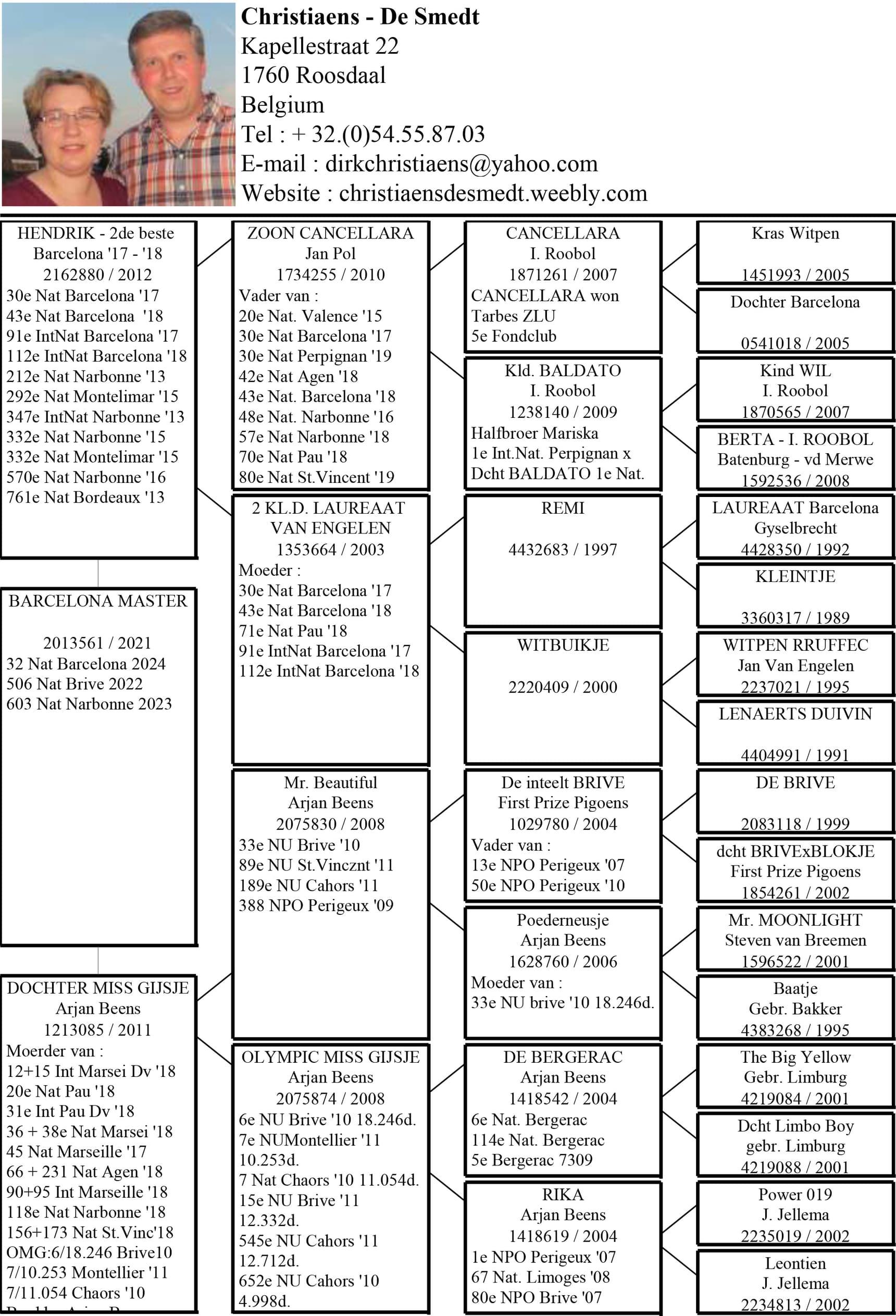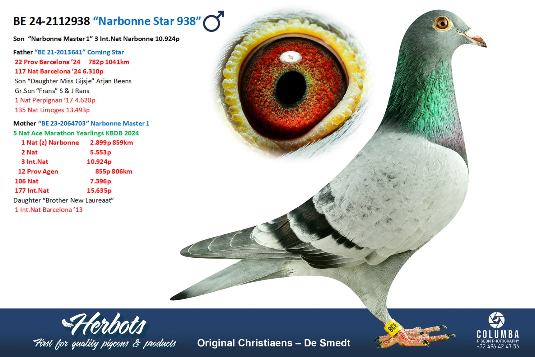 Son of “BE 15-083” Louis Van den Eynde x “BE 14-144” Granddaughter “New Laureaat” 1 Int.Nat Barcelona Luc Wiels