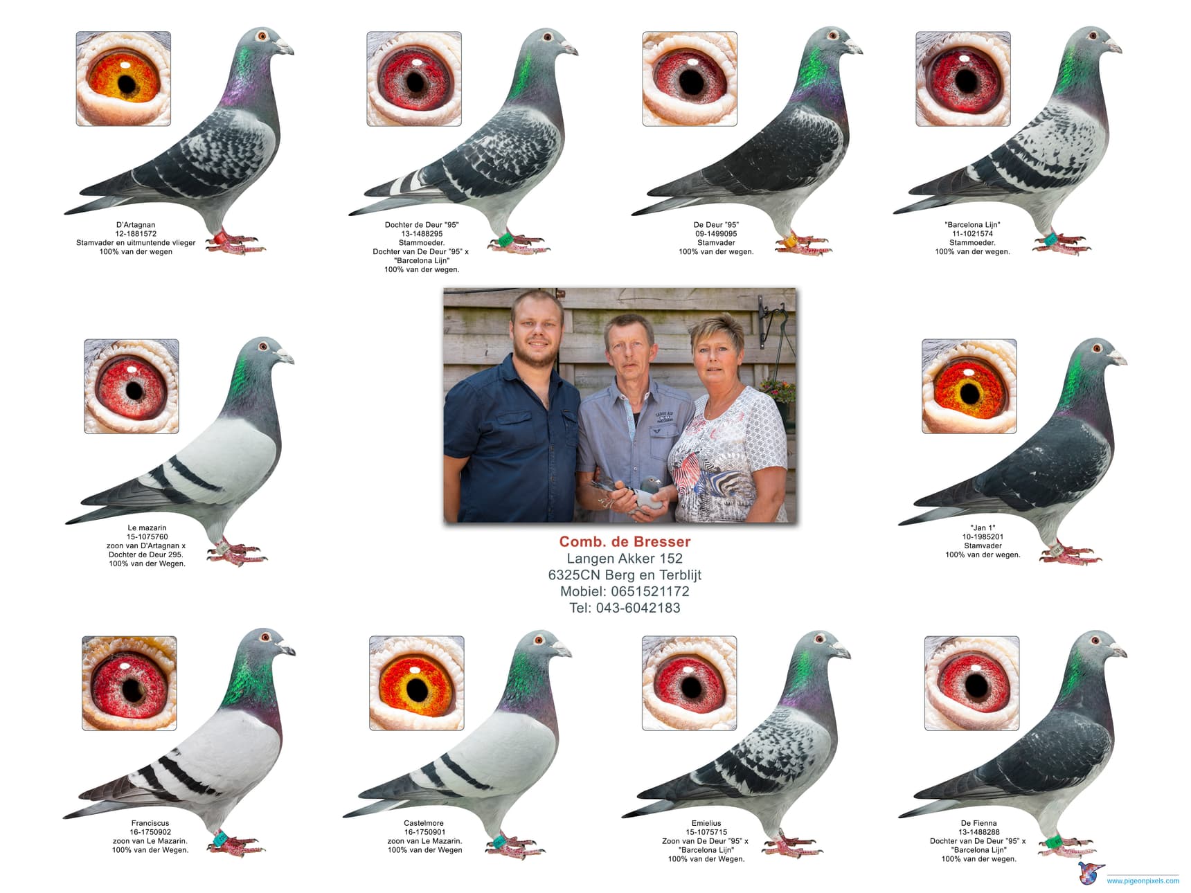Hij stamt af van bewezen topduiven in deze kolonie, zijn vader “NL 1075760-15” Le Marazin won zelf het jaar voordien 89ste Nationaal Marseille en de grootvader is de beste vlieger van de voorbije jaren. “NL 1881572-12” D’Artagnan was 3de Nat Asduif Marseille ’14-’16 en 7de Nat Asduif Agen ‘14’-’16. Wat wil zeggen dat hij scoorde op beide vluchten in 3 jaar en volgende nationale noteringen liet zien. Hij won 11 + 129 + 250 Nationaal Marseille en 85 + 401 + 553 Nationaal Agen. Hij is een volledige inteelt naar “Turbo” 1ste Nationaal Pau van A & L Van der Wegen.