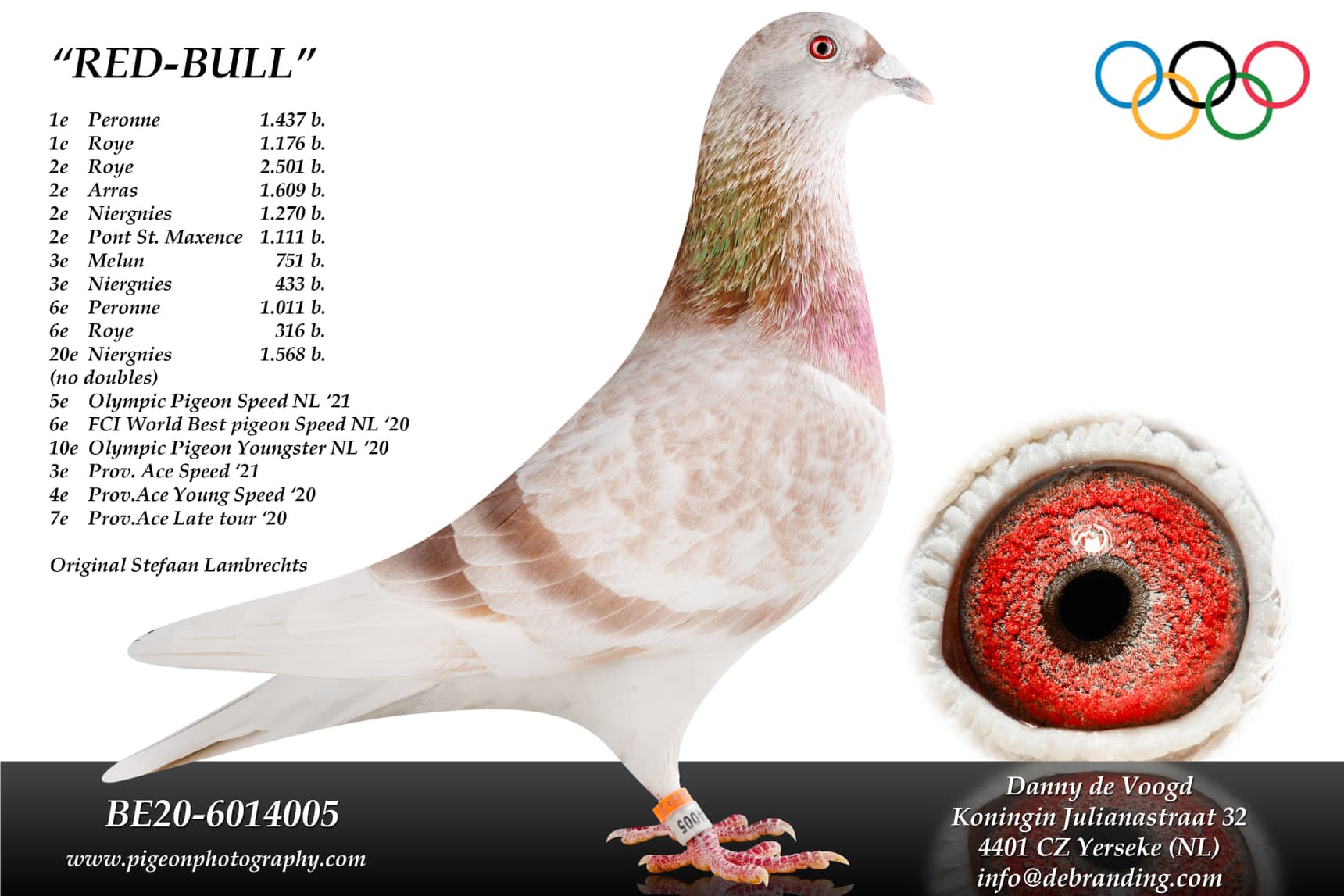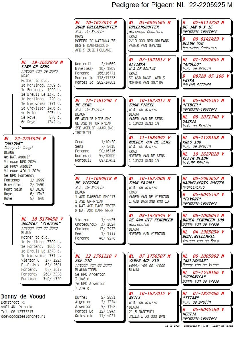 Over the years Danny has bought many pigeons from different lofts, but he had never experienced a success like the pigeons from Stefaan Lambrechts. These pigeons gave his colony an enormous boost. Both in pure form and crossed with his pigeons from Paul d'Hondt and Willem de Bruijn they performed exceptionally well. Also the acquisitions of Antoon v/d Burg provided several excellent breeders. In addition, Danny knew with Stef Bals, with Stef, an excellent flyer to obtain.