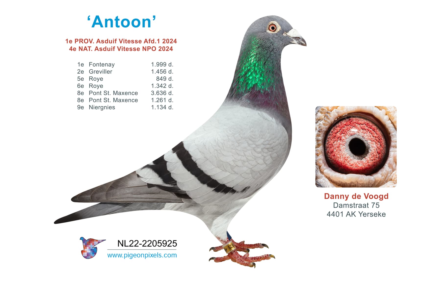 What Danny accomplished in 2024 is nothing short of spectacular. Despite the transition and challenges of a new address, he managed to produce top results from the beginning of the season. With his unique approach and a strong, well-built system, he has surprised friend and foe.A special thanks goes out to Martin v/d Jagt, who helps weekly with collecting and basketing the pigeons. Without his help Danny would not be able to basket his pigeons and his success would have been a lot more difficult.