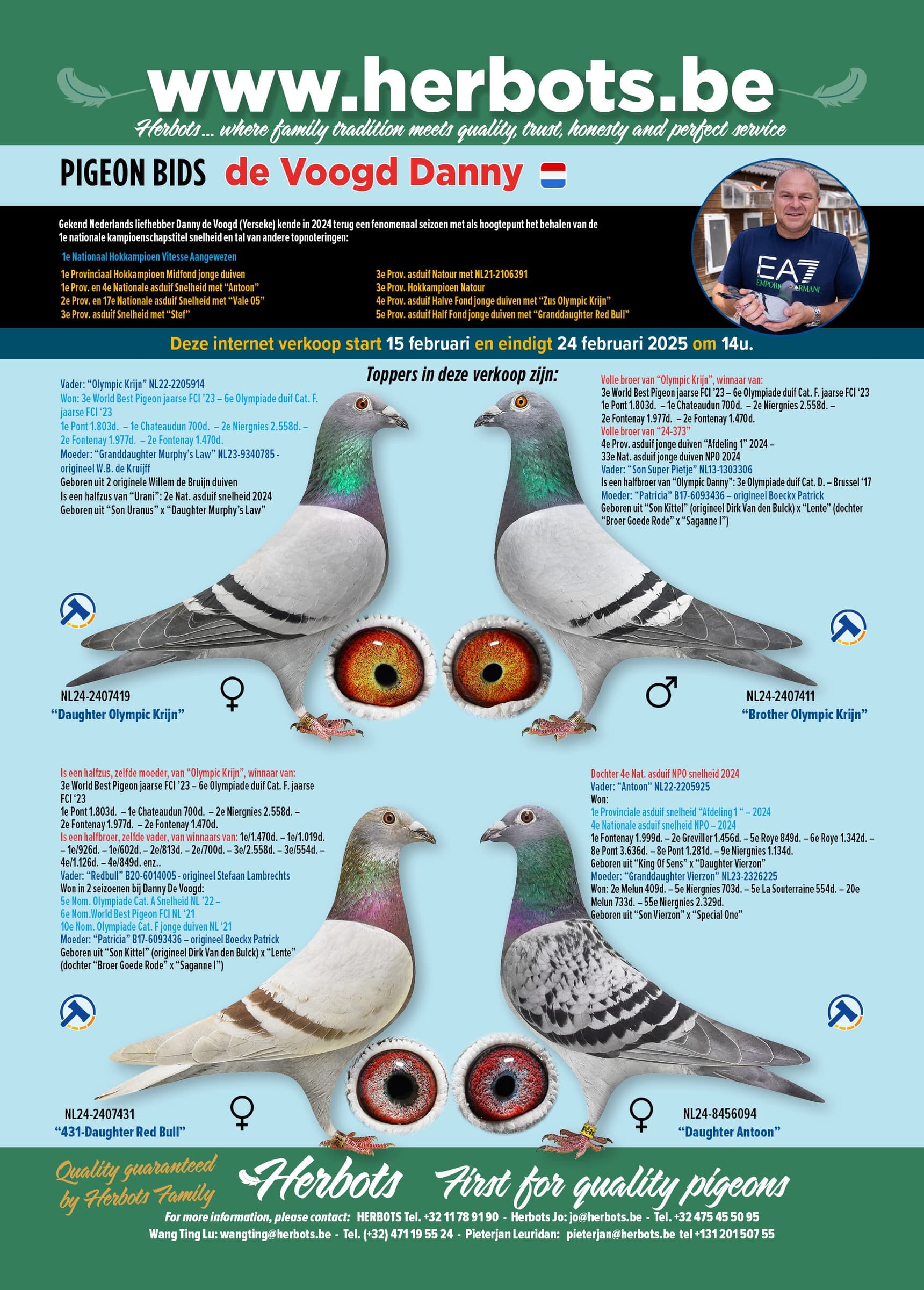 In this auction you can find two children of him NL24-2407419 blue hen (buy 2) , NL24-2407421 (buy 1) blue cock and also a full brother of “Olympic Krijn” NL24-2407411 (buy 3) blue cock