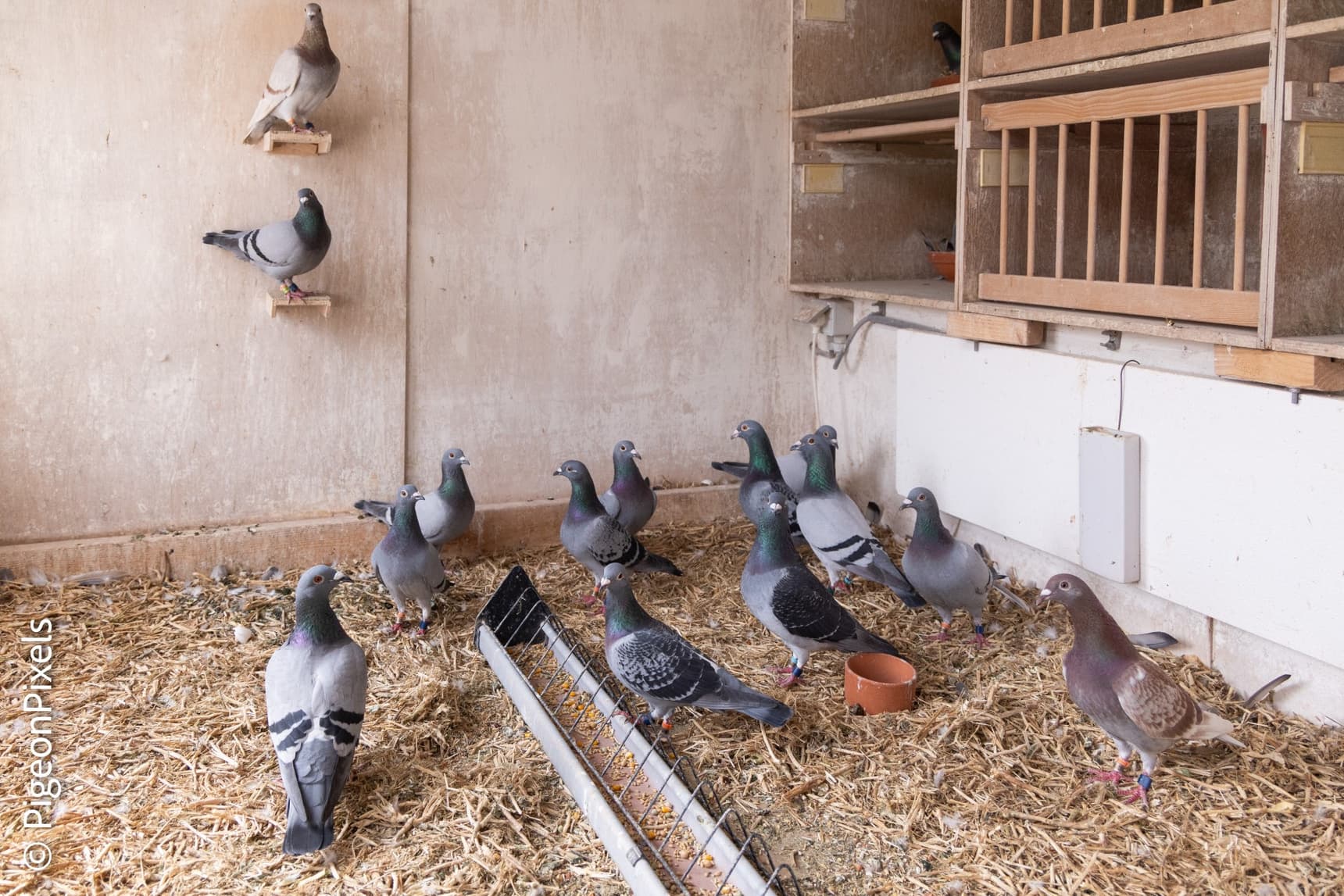 Danny designed his coop to require minimal maintenance and provide an optimal climate. The floor is covered with bean straw, which provides a dry and hygienic environment. Under the straw is underfloor heating, which is used especially in the spring to prevent moisture problems. He also uses infrared heating, which is set at 15 degrees during the flying season and later lowered to 12.5 degrees depending on the outside temperature. Large windows in the front provide a constant supply of fresh air, and the ceiling is completely open, with no sliders. This keeps oxygen circulation optimal and keeps humidity around 60% , a crucial aspect for top performance.