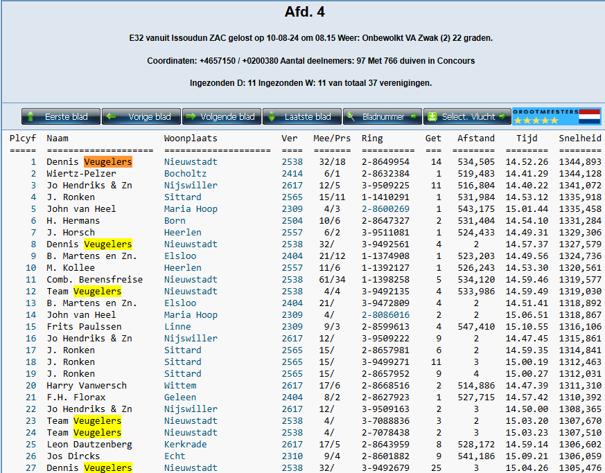 Issoudun and Dennis Veugelers is a successful combination this year, a few weeks ago he won 1st + 2nd NPO Issoudun against 1,498 old pigeons. Now in the national flight from Issoudun he again wins 1st NPO Issoudun of 766 old birds and this with a daughter of his stock hen “Miss Koopman”. The 2nd arrival, which is good for 8th NPO Issoudun, is also a half-sister of the first pigeon from the same father.