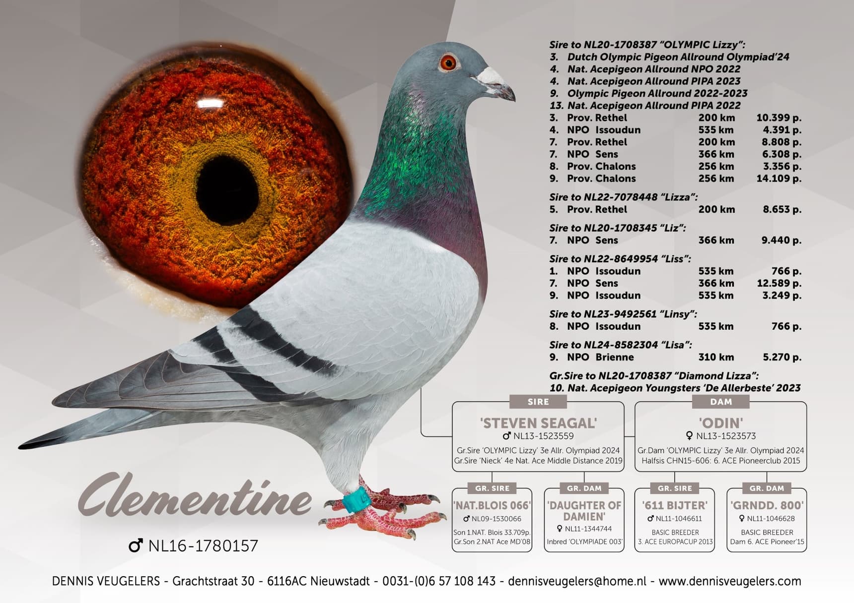 Son of “NL 559/13” Steven Seagal 1 Charleville 3,659p – 11 NAT Orléans 15,815p x “NL 573/13” Odin wins 2 x TOP 60 NPO Lorris 12,000 pigeons