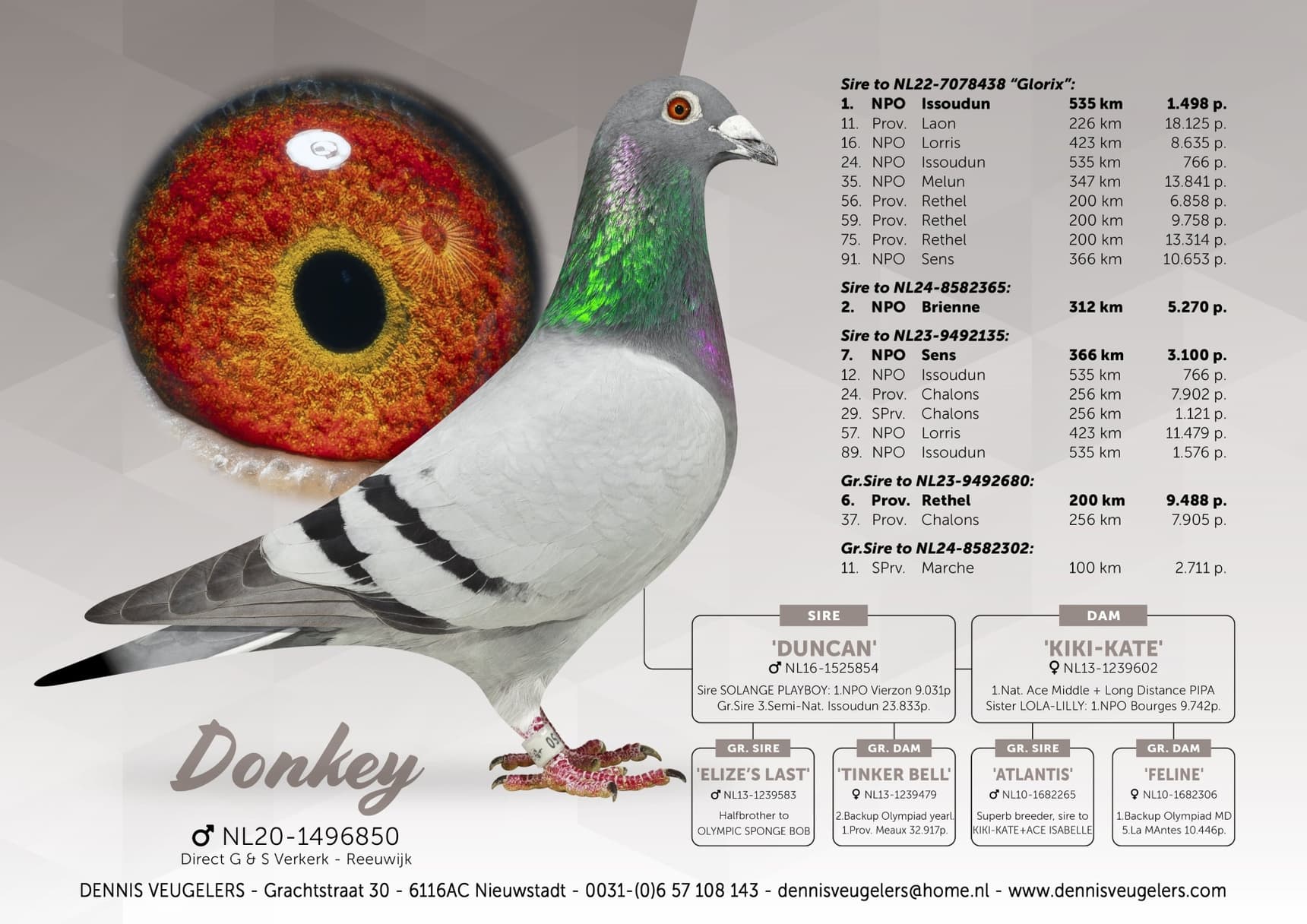 Son of “854/16” Duncan 1 Asse 3,636p – 5 NPO La Souterraine 4,783p x “602/13” Kiki Kate 1 Nat Ace Pigeon middle distance and long distance Pipa
