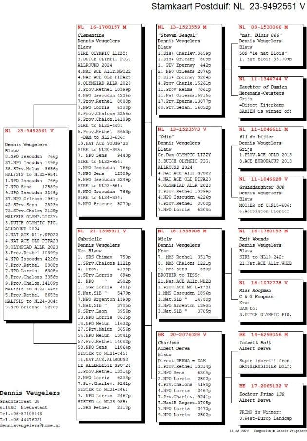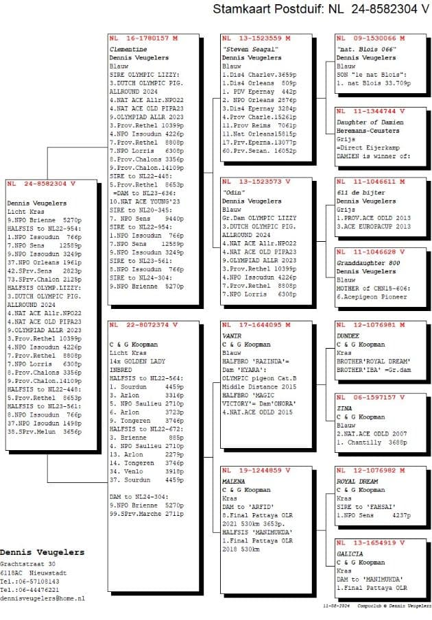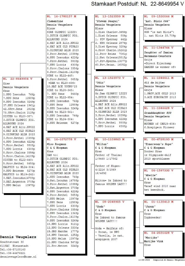 Super racing hen, won herself 1 S.Prov. Chalons 1,121p – 1 Chimay 750p – 2 NPO Lorris 2,502p – 5 Nat Sector Lorris 5,479p – 7 Nat Sector Argenton 3,705p – 9 S.Prov. Laon 3,956p – 13 NPO Lorris 8,635p – 18 NPO Melun 11,632p – 27 S.Prov. Melun 3,656p – 54 NPO Melun 13,841p – 57 Prov Rethel 14,082p – 58 NPO Sens 11,864p