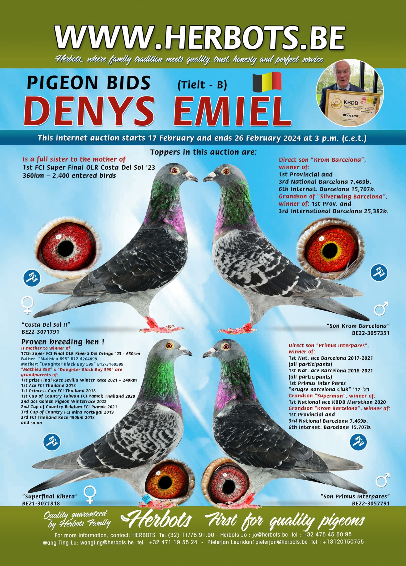 All-round colony Emiel Denys offers on internet auction Pigeon Bids a strictly selected group of pigeons all born from his very best breeding lines