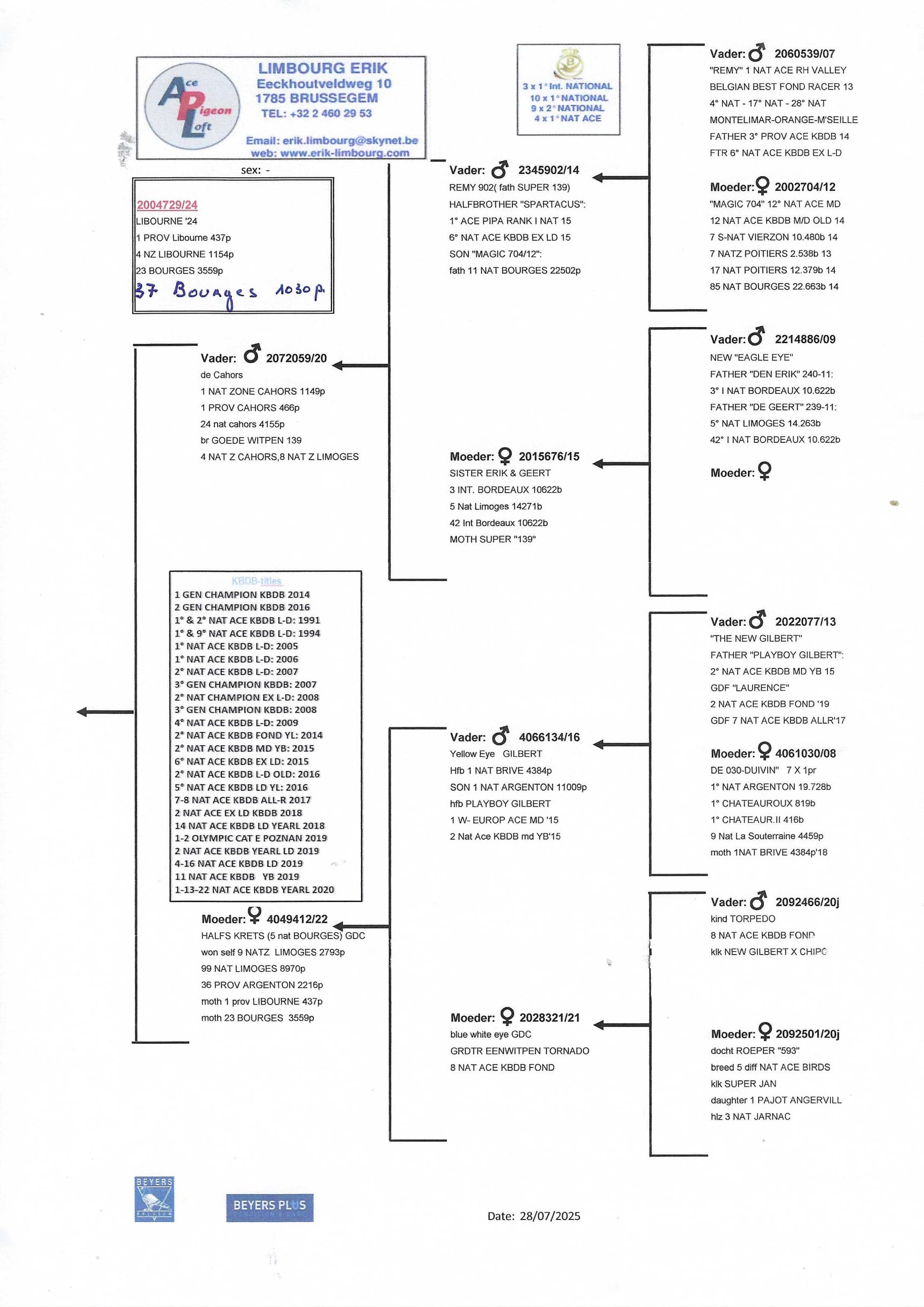 erik limbourg (brussegem) ends his season with several national ace pigeons in the long distance