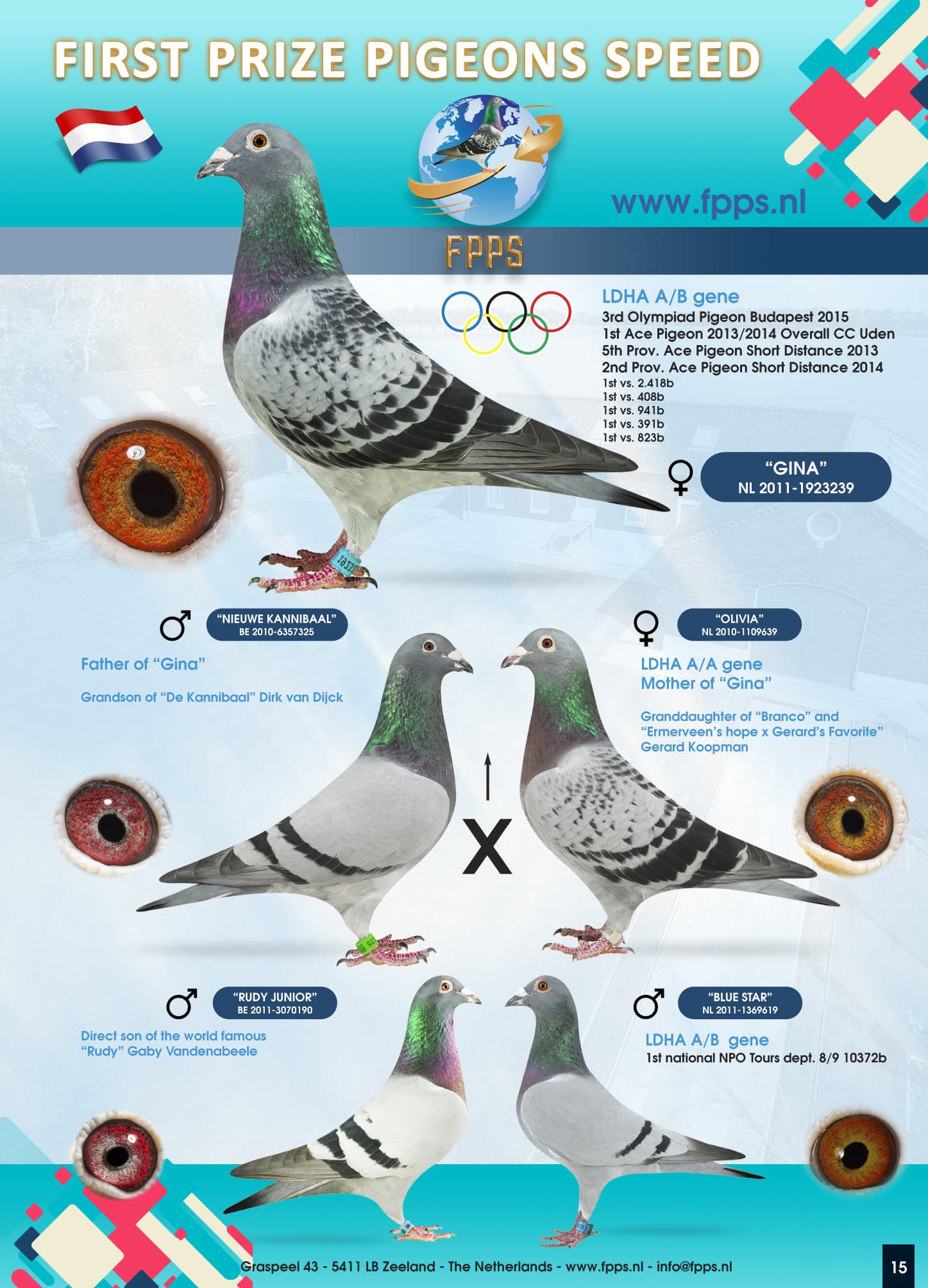 As mentioned before is “Gina” NL11-1923239 also added to the richly filled breeding loft from FPPS. ‘Gina’ became in 2015 Olympiad bird in Budapest.